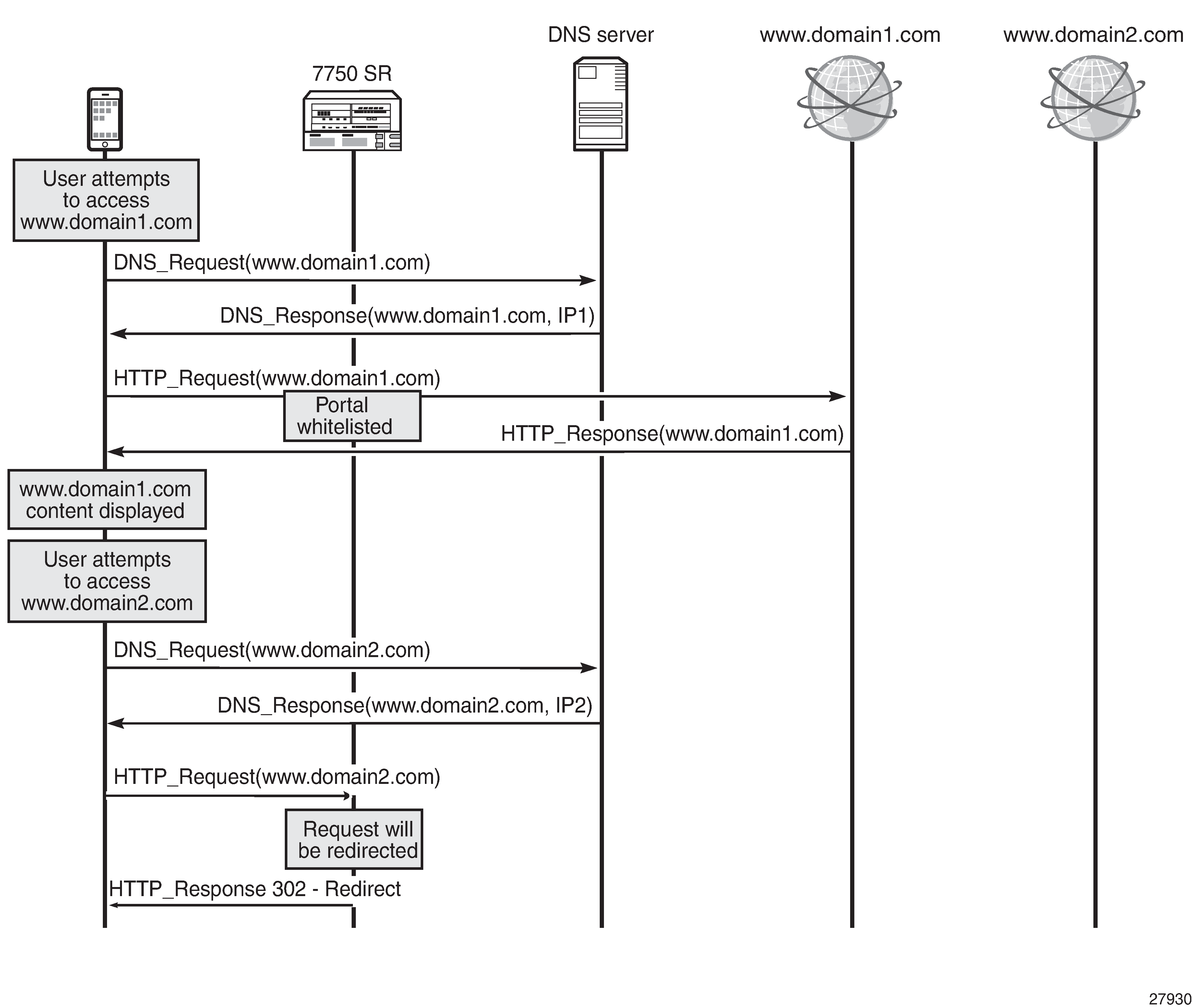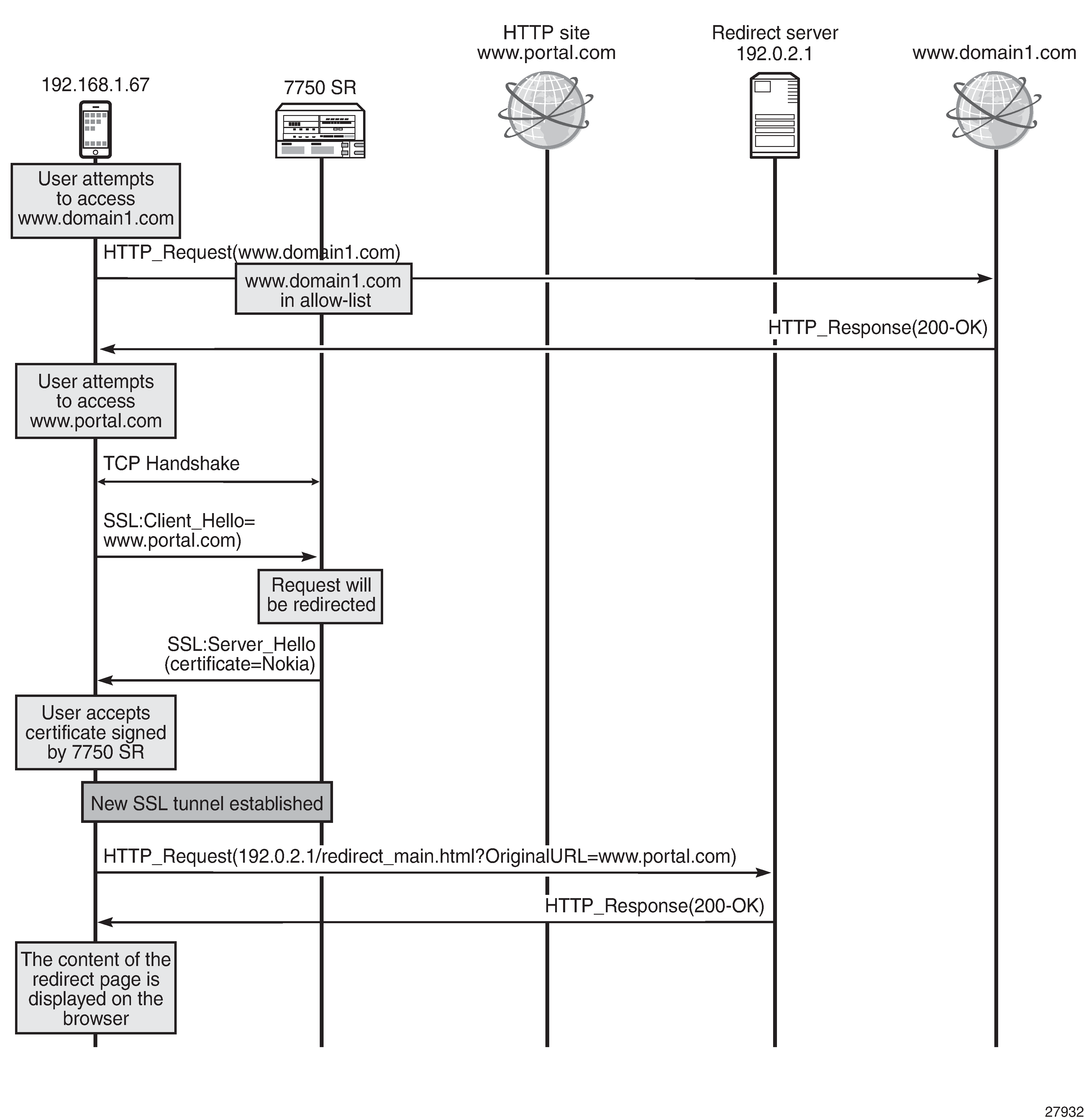 URL filter triggered HTTP redirect or HTTPS captive redirect (SR OS Release 16.0): redirects all HTTP/HTTPS traffic, based on a URL filter policy decision, where on block decision, the request can be redirected to a message portal