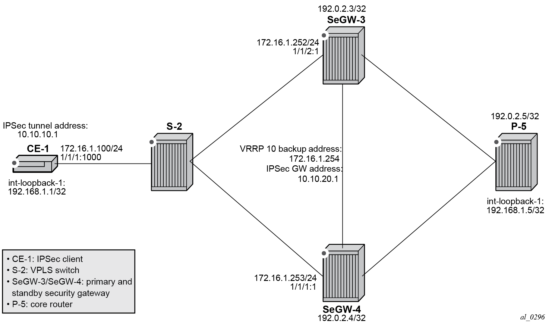 VRRP 10 between SeGW-3 and SeGW-4 to provide a backup address 192.168.1.254, which is the default next hop for CE-1.