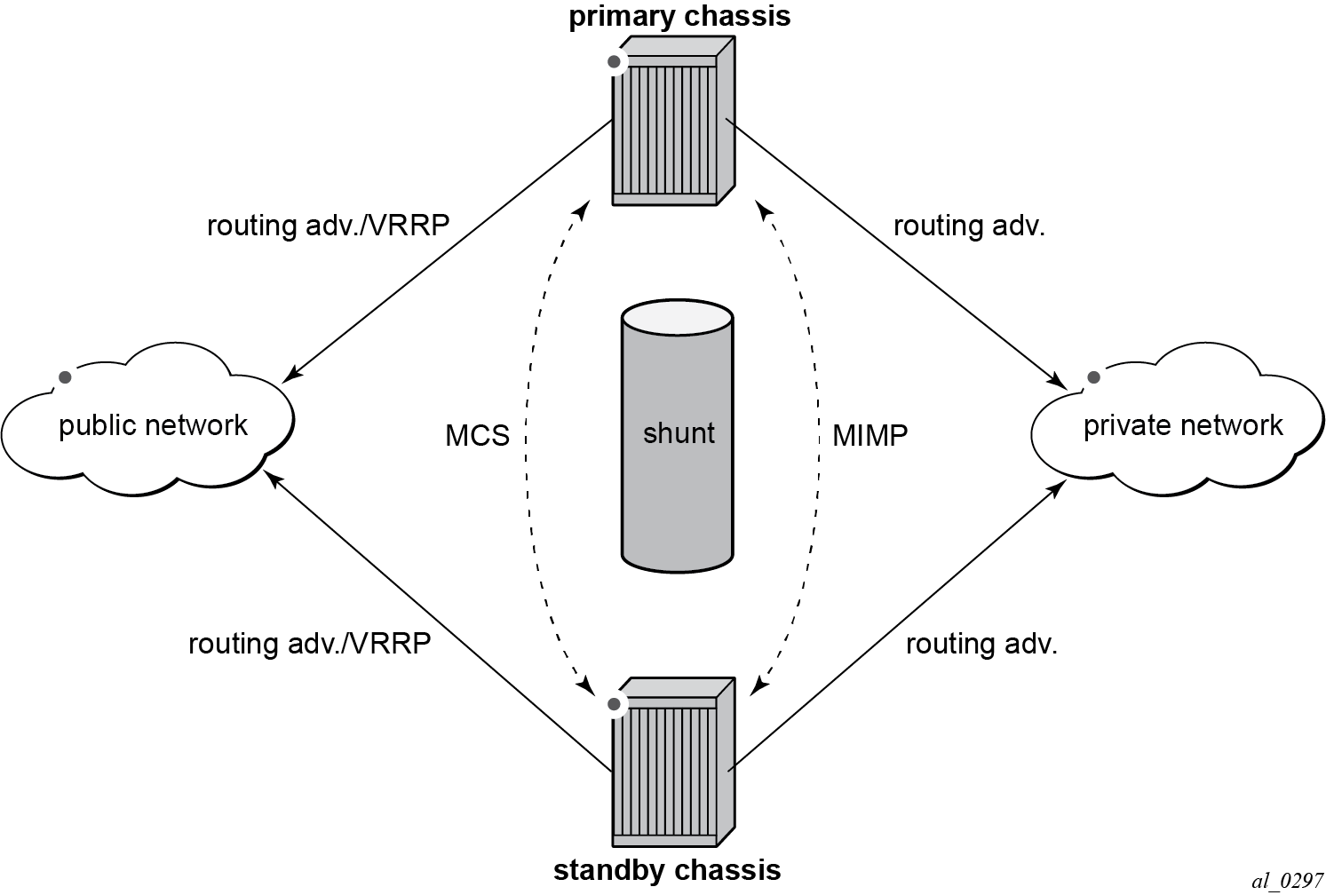 The direct and redundant physical link between MC-IPSec chassis must be configured with sufficient bandwidth for MCS and shunting traffic, and proper QoS configuration to make sure the MIMP and MCS packets are treated as high priority traffic.