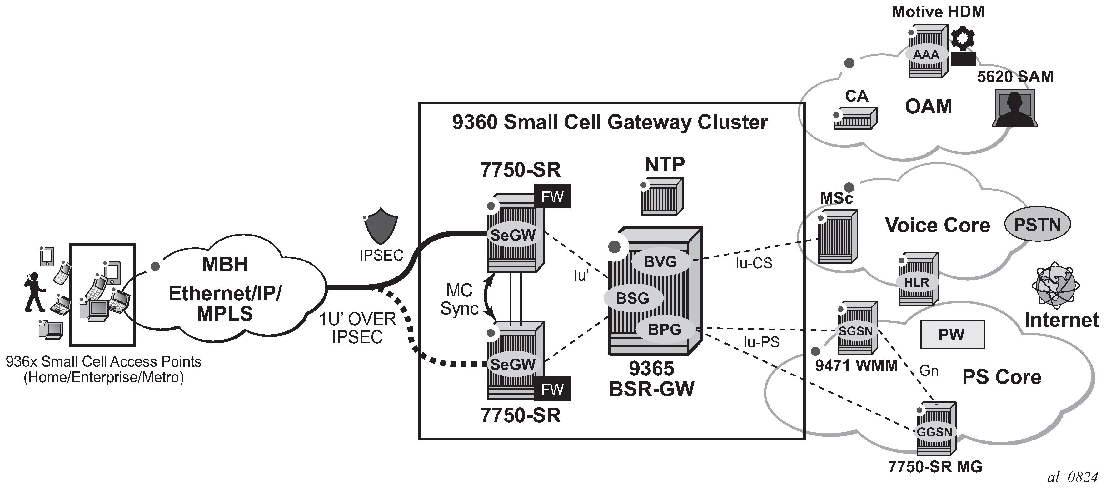 Similarly, the SeGW architecture for Femto deployment is based on two SR OS systems terminating the mobile backhaul side (front-end and connecting to, for example, a base station router gateway and other network elements of the packet core (back-end), as per SeGW in small cells architecture: