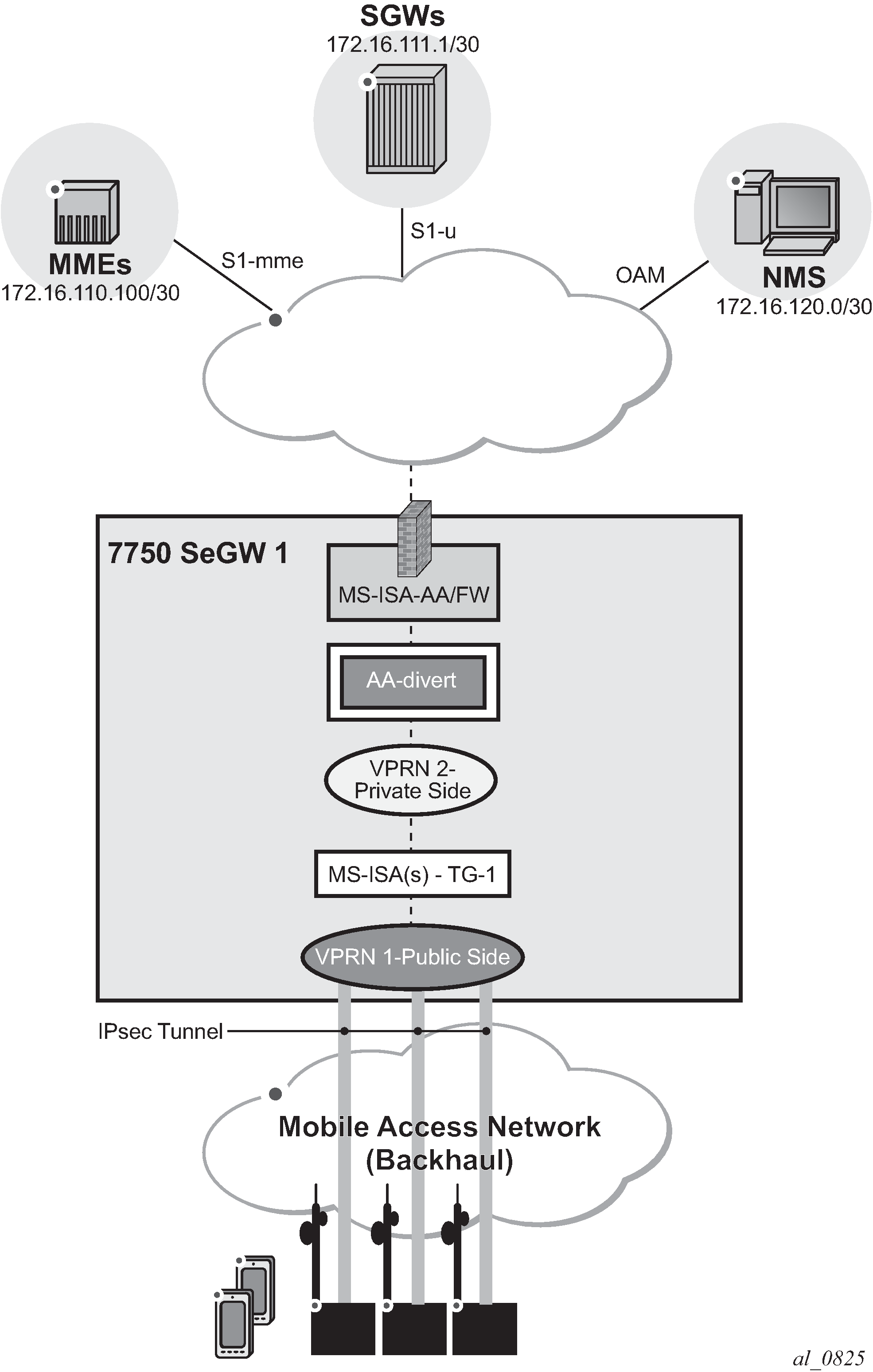 In this example, one private VPRN is used for all traffic to and from eNBs. In some small cell deployments, eNB traffic is split into three different VPRNs: one for control (S1-MME), one for management (OAM), and one for bearer traffic (S1-U GTP-U). In that case, each of these VPRNs needs to be diverted into AA-ISA to provide firewall protection.