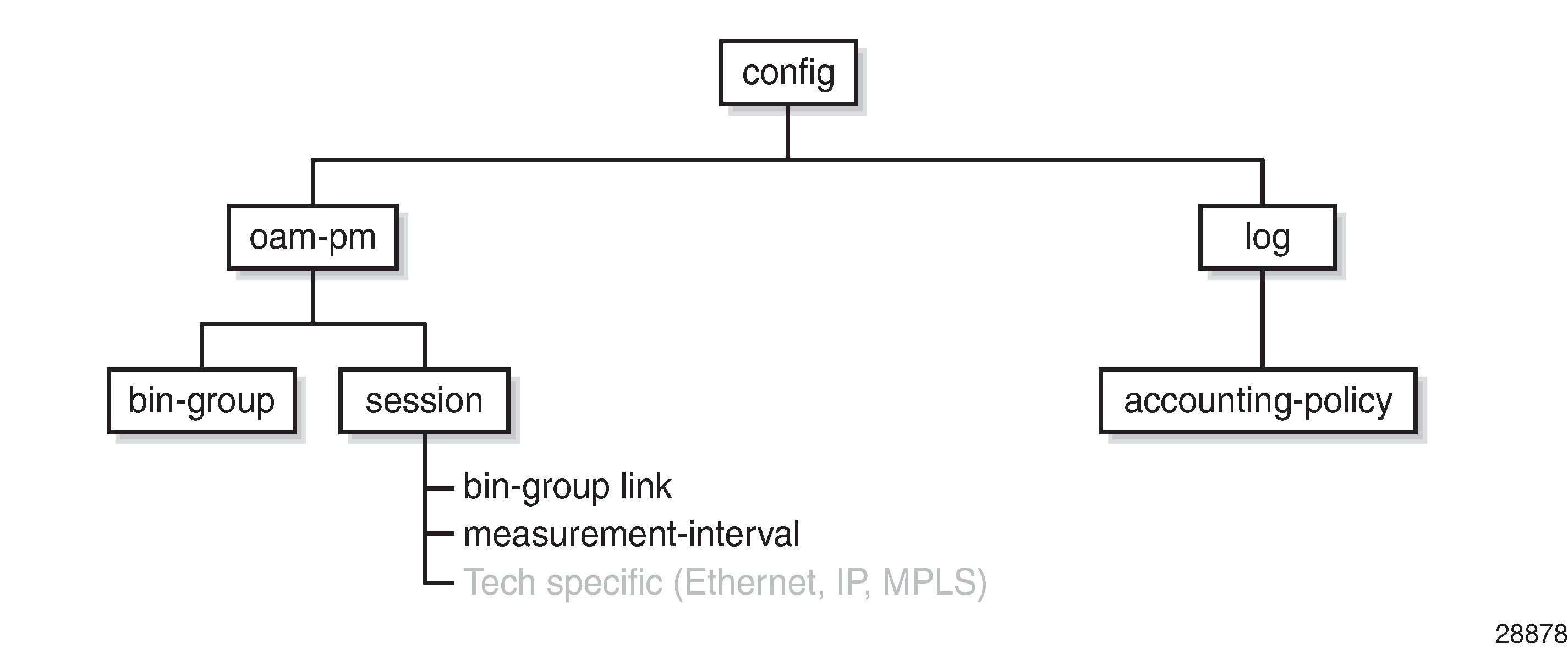 Most of the configuration elements for the infrastructure components are directly located under the OAM-PM hierarchy. However, there are some linkages to other optional subsystems, such as accounting policies. Configuration tree provides the topics that are included in the configuration section. The "Tech specific (Ethernet, IP, MPLS)" block has been grayed out, because it is not included in this chapter.