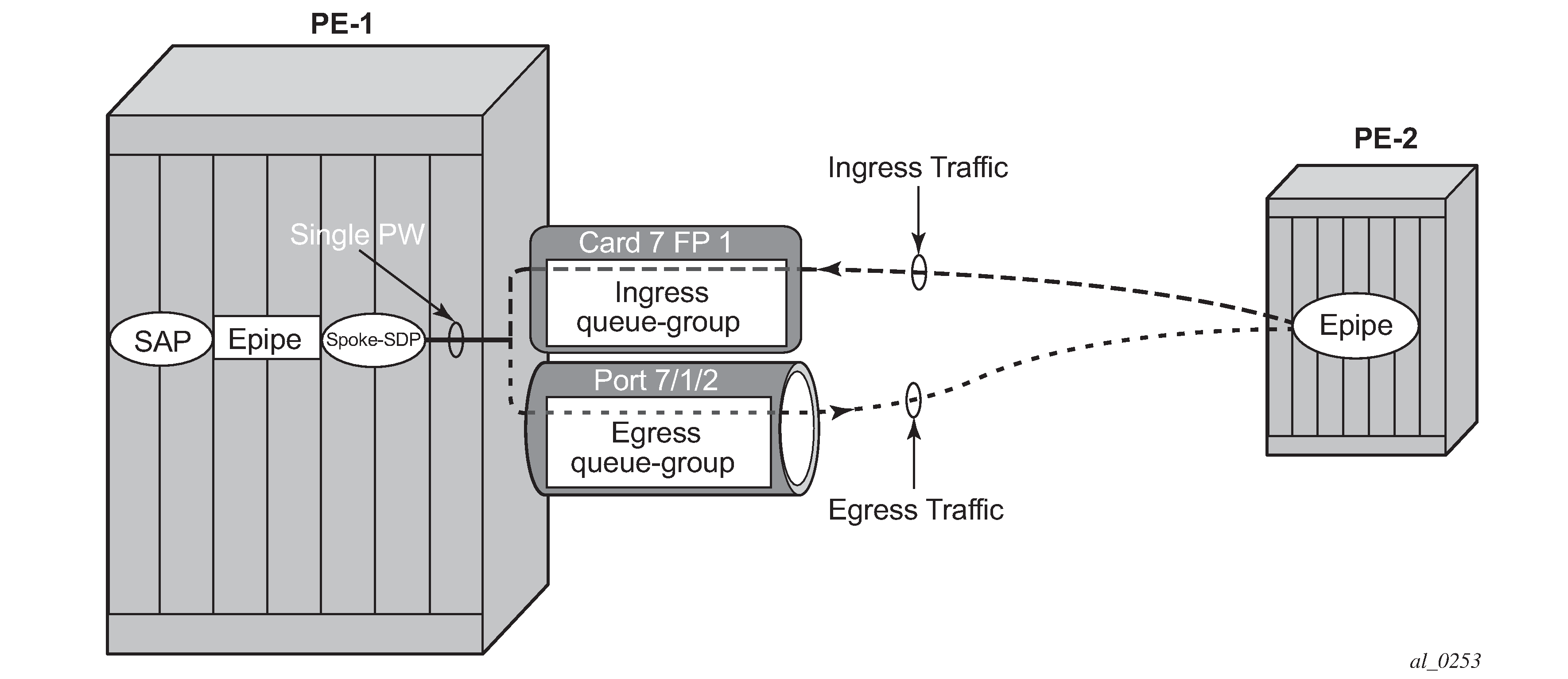 Although this example makes use of both ingress and egress queue groups, the focus is pseudowire QoS, so the full details of queue group configuration are not covered.