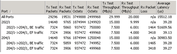 The throughput achieved using the preceding configuration can be verified in the traffic generator output. Port 202/1 is connected to PE-1 and port 204/1 is connected to PE-2.