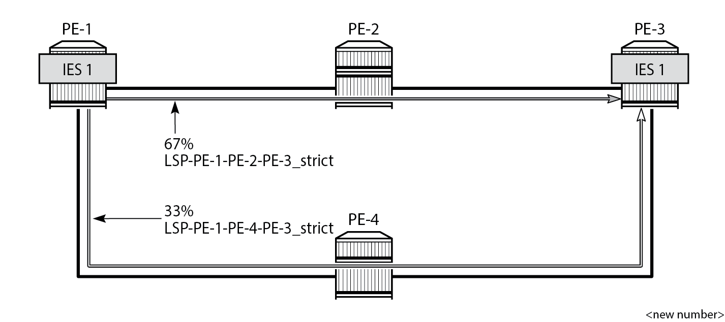 MPLS paths with strict hops from PE-1 to PE-3 and the other way around: one via PE-2 and the other via PE-4. The LSP via PE-2 gets a load balancing weight of 2, whereas the LSP via PE-4 gets a load balancing weight of 1. Both LSPs have the same metric.