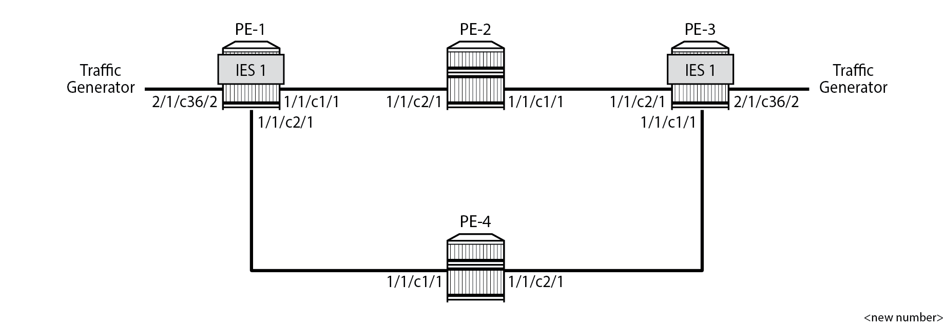 In this example, the traffic generator sends IPv6 traffic to the SAP in IES 1. The IPv6 packets are tunneled through the IPv4 network between PE-1 and PE-3. The service configuration on PE-1 is as follows: