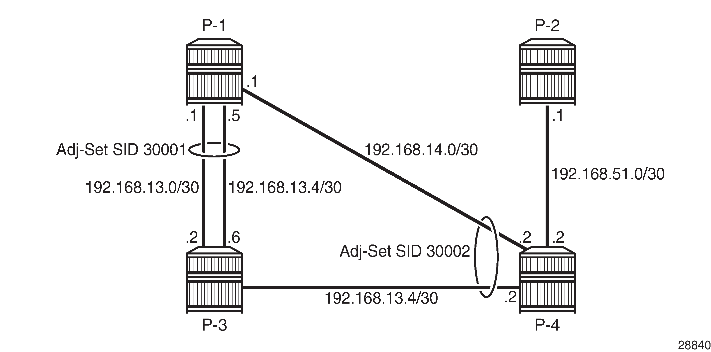 In Parallel and non-parallel adjacency sets, two adjacency sets are defined. A first adjacency set is defined on P-1 with adjacency set SID 30001. Two parallel links are available between P-1 and P-2, and by combining them into an adjacency set, traffic can be shared across both links. A second set is defined on P-4, with adjacency set SID 30002. However, the member links of that set are not terminated on the same router pair, so traffic cannot be shared.