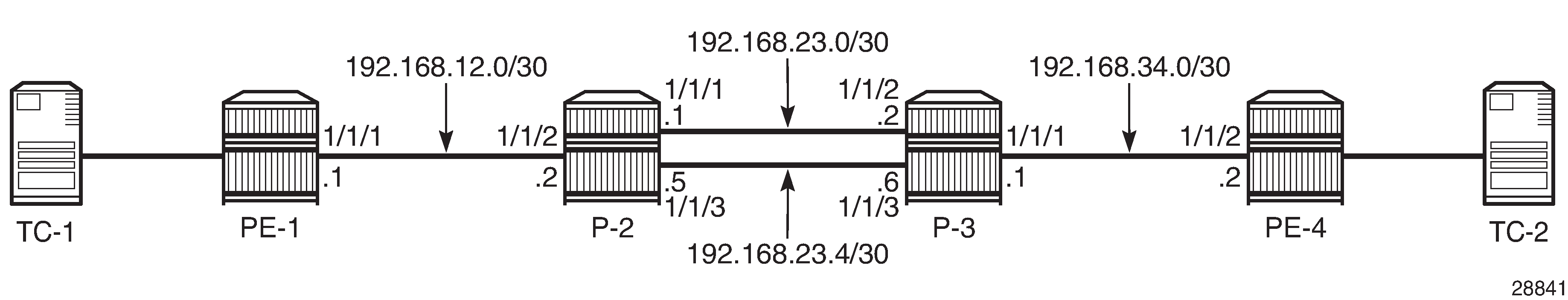 The topology used in this chapter is shown in Parallel adjacency set. All nodes are configured for SR and IS-IS level 2. If test center TC-1 is connected at PE-1 and test center TC-2 is connected at PE-4, traffic can be sent from TC-1 to TC-2 following the PE-1, P-2, P-3, PE-4 path. Two links are active between P-2 and P-3, and these links belong to the same adjacency set.