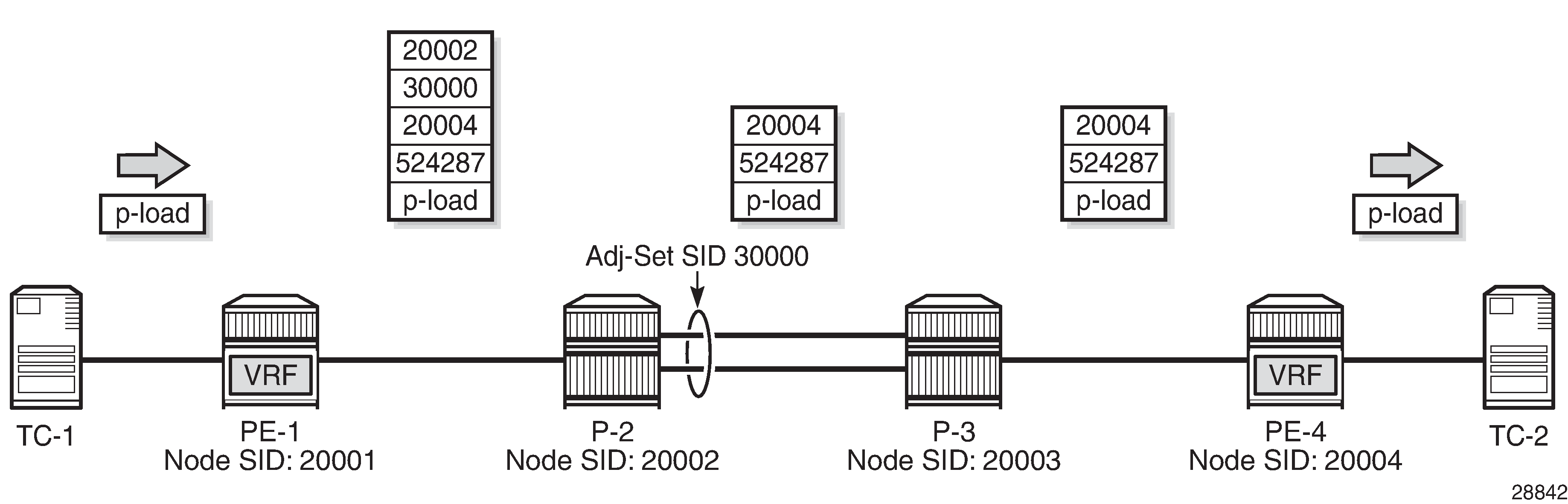 MPLS label stack shows the MPLS label stacks on the path from a loopback interface on PE-1 to a loopback interface on PE-4. PE-1 pushes the {20002, 30000, 20004, 524287} label stack to packets received from a loopback interface on PE-1. The bottom of the stack is the {524287} VPN service label. The active label is node SID 20002, so the traffic flow takes the shortest path to P-2, which pops this label. Because {30000} is the label for the adjacency set, this label is popped while spraying the traffic flow across the two links available to P-3. Now the active label is node SID 20004, so the traffic flow takes the shortest path to PE-4; therefore, P-3 swaps {20004} to {20004}. When the traffic flow arrives at PE-4, PE-4 pops the {20004} node SID and the {524287} VPN service label before delivering the traffic to a loopback interface on PE-4.