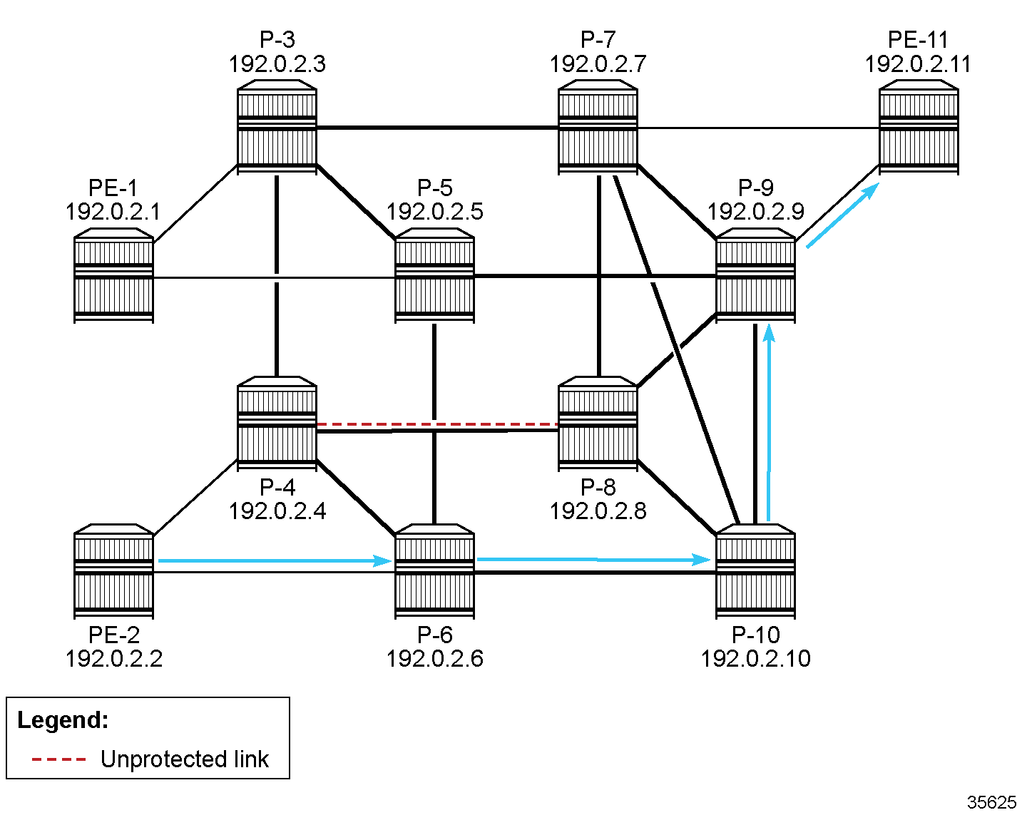 Path from PE-2 to PE-11 including unprotected link shows the established path from PE-2 to PE-11, which uses protected and unprotected links.