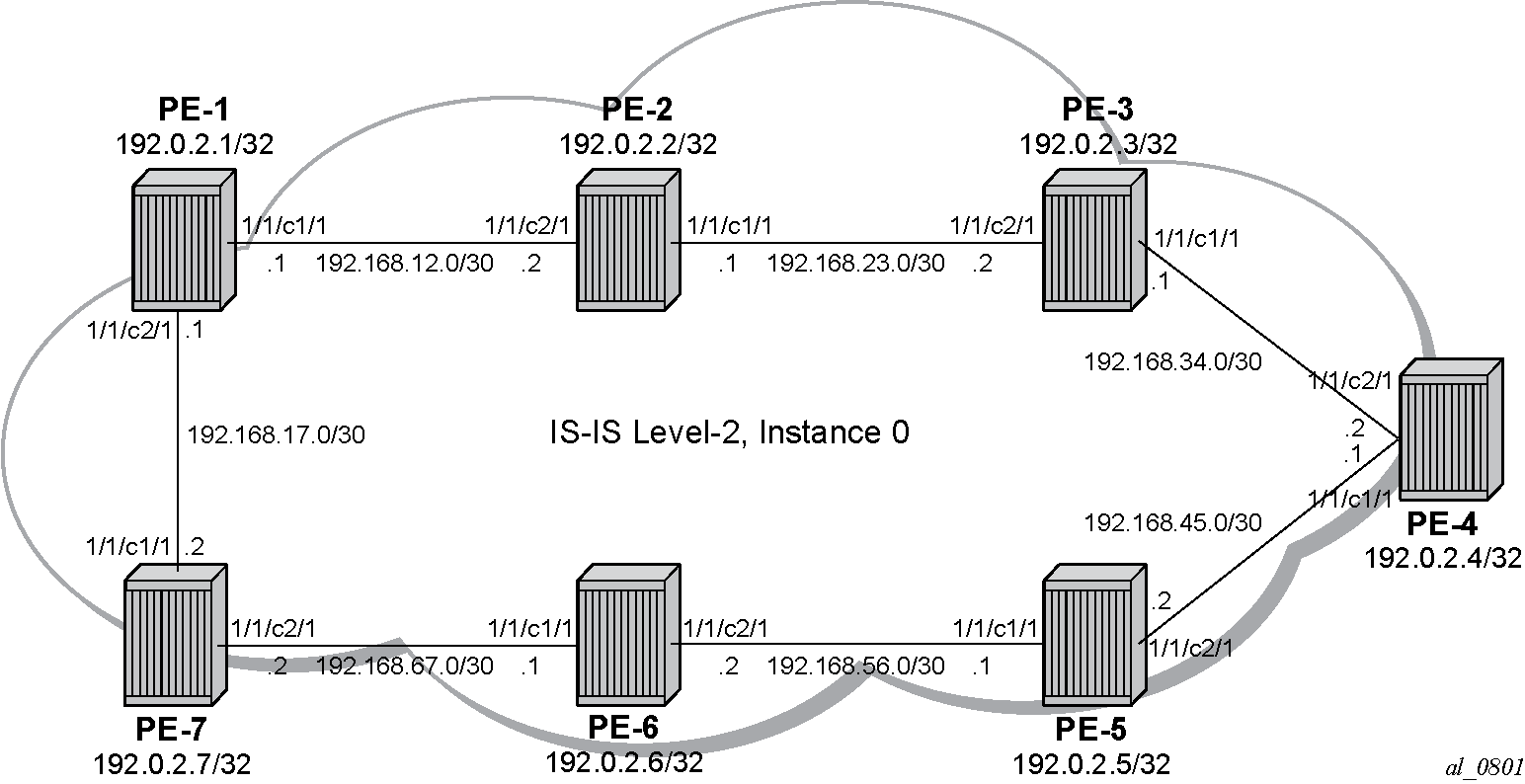 The following example uses IS-IS as an IGP protocol, with an MPLS data plane and services enabled using LFA and RLFA. Example topology shows the example topology with seven PEs.