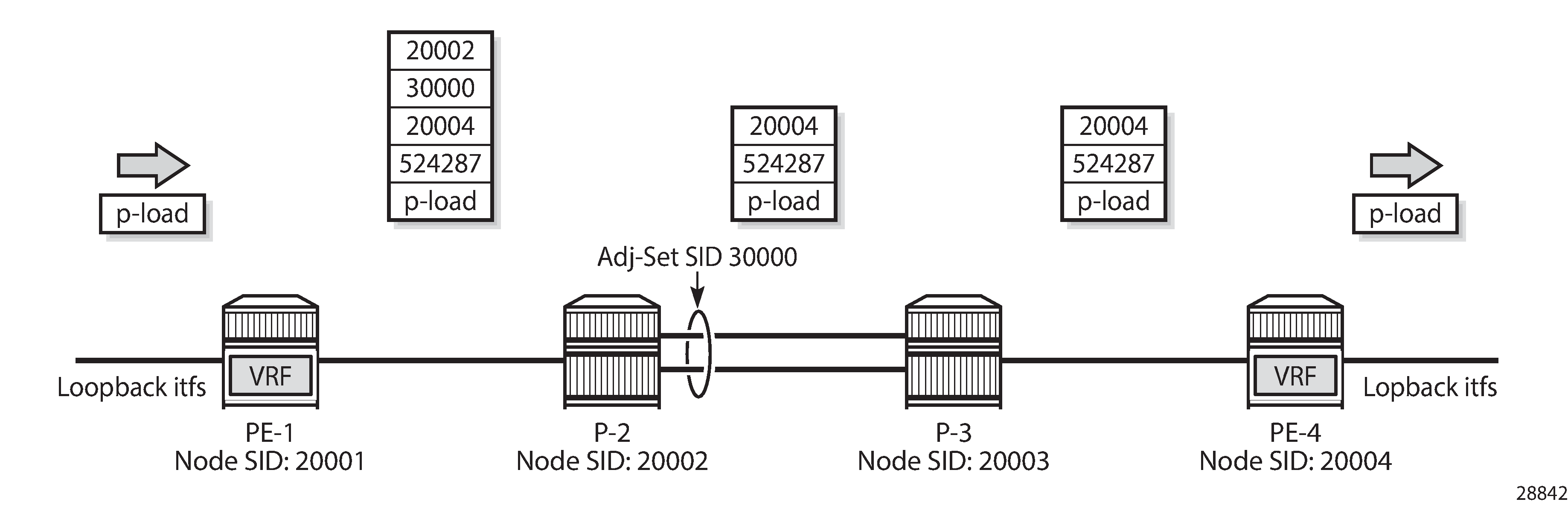 MPLS label stack shows the MPLS label stacks on the path from a loopback interface on PE-1 to a loopback interface on PE-4. PE-1 pushes the {20002, 30000, 20004, 524287} label stack to packets received from a loopback interface on PE-1. The bottom of the stack is the {524287} VPN service label. The active label is node SID 20002, so the traffic flow takes the shortest path to P-2, which pops this label. Because {30000} is the label for the adjacency set, this label is popped while spraying the traffic flow across the two links available to P-3. Now the active label is node SID 20004, so the traffic flow takes the shortest path to PE-4; therefore, P-3 swaps {20004} to {20004}. When the traffic flow arrives at PE-4, PE-4 pops the {20004} node SID and the {524287} VPN service label before delivering the traffic to a loopback interface on PE-4.