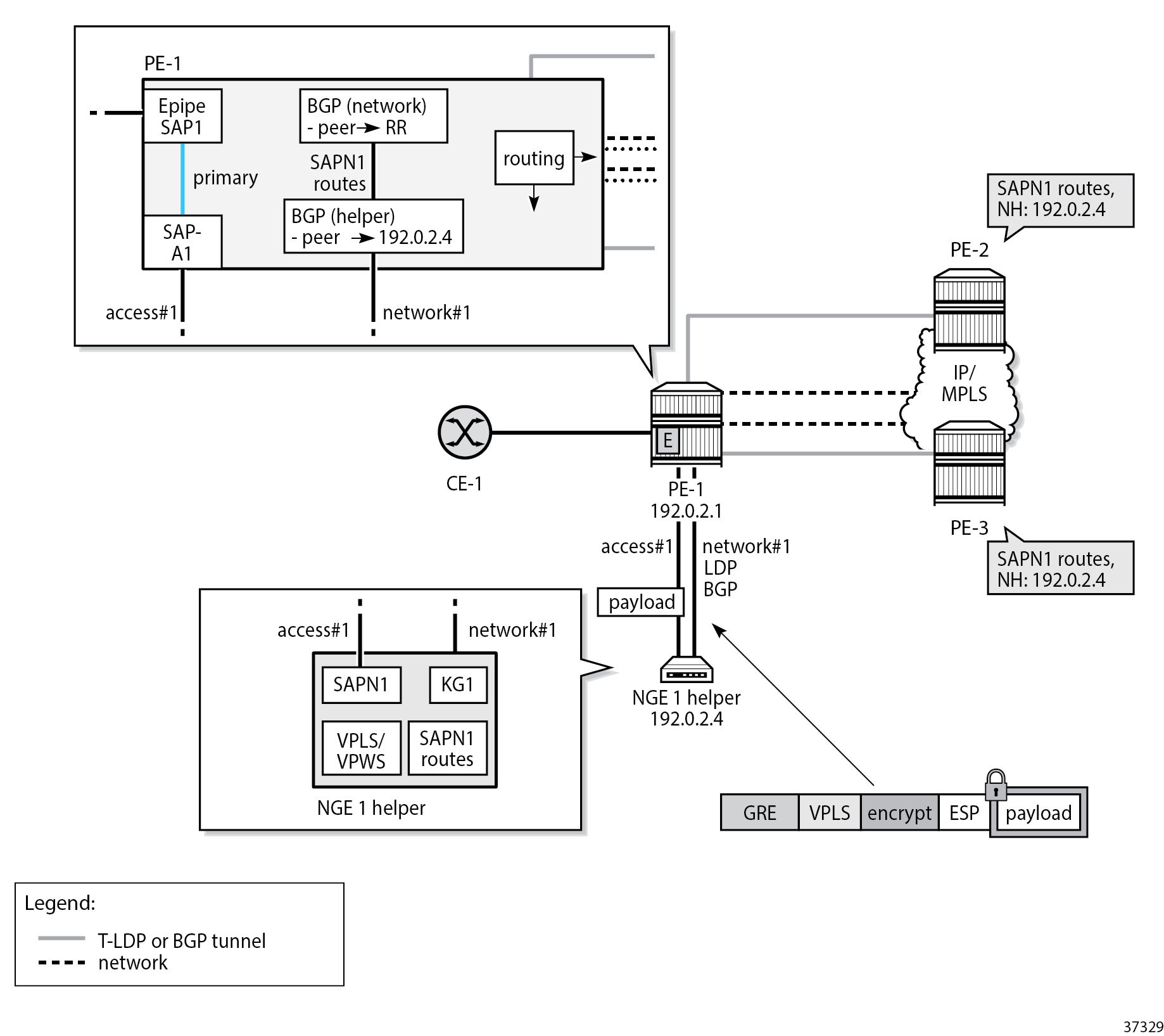 This scenario is similar to the VPRN auto-bind scenario, except that a BGP session is used to advertise L2 routes to and from the NGE helper where remote PEs can send GRE L2 packets encrypted with the associated NGE configuration under the pw-template context.
