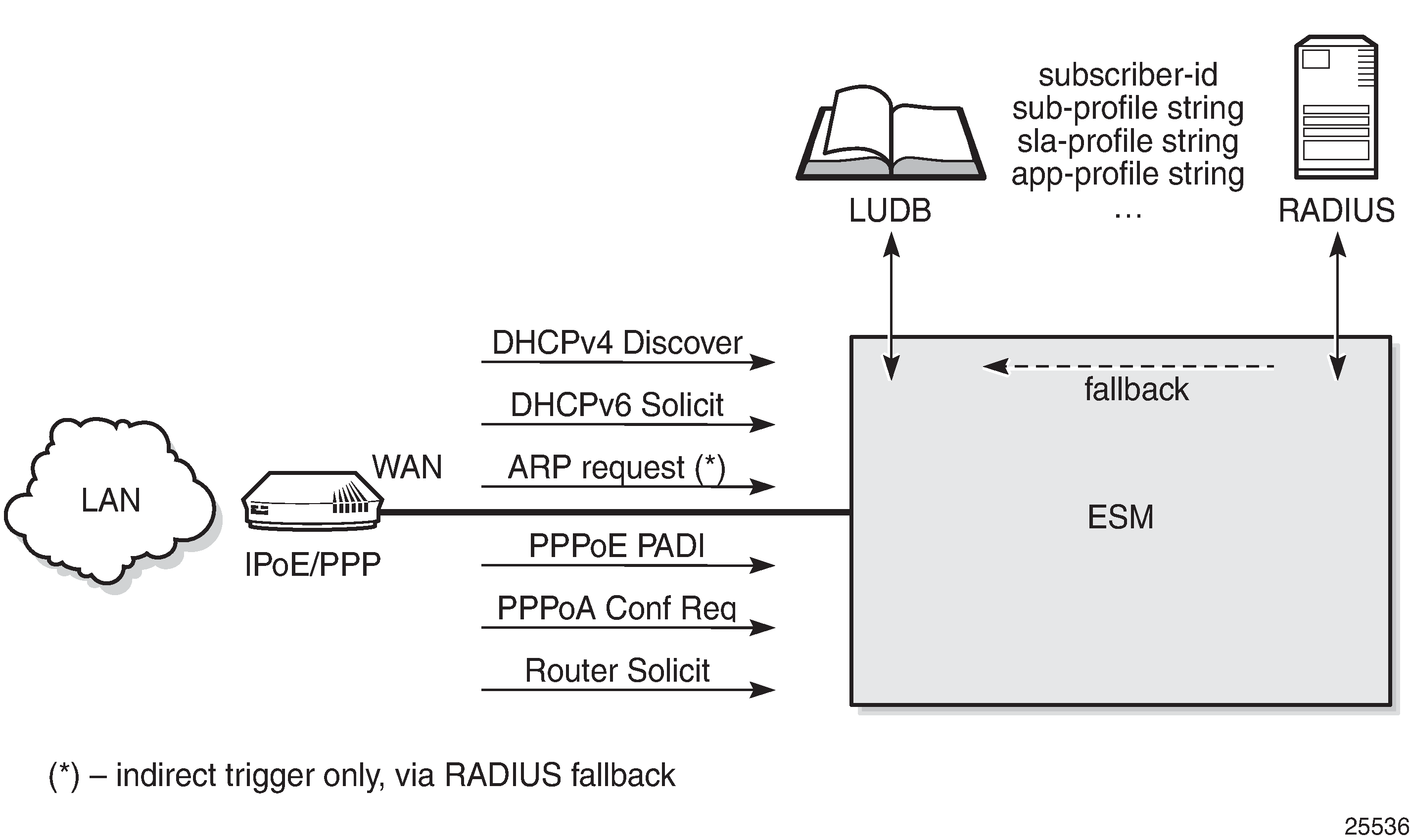 When triggered, ESM can directly access an LUDB because the LUDB is applied to the service directly (through one of its sub-contexts), or indirectly as a fallback action for RADIUS (through the authentication policy); see Direct and indirect LUDB authentication. ARP requests can only trigger LUDB authentication indirectly.