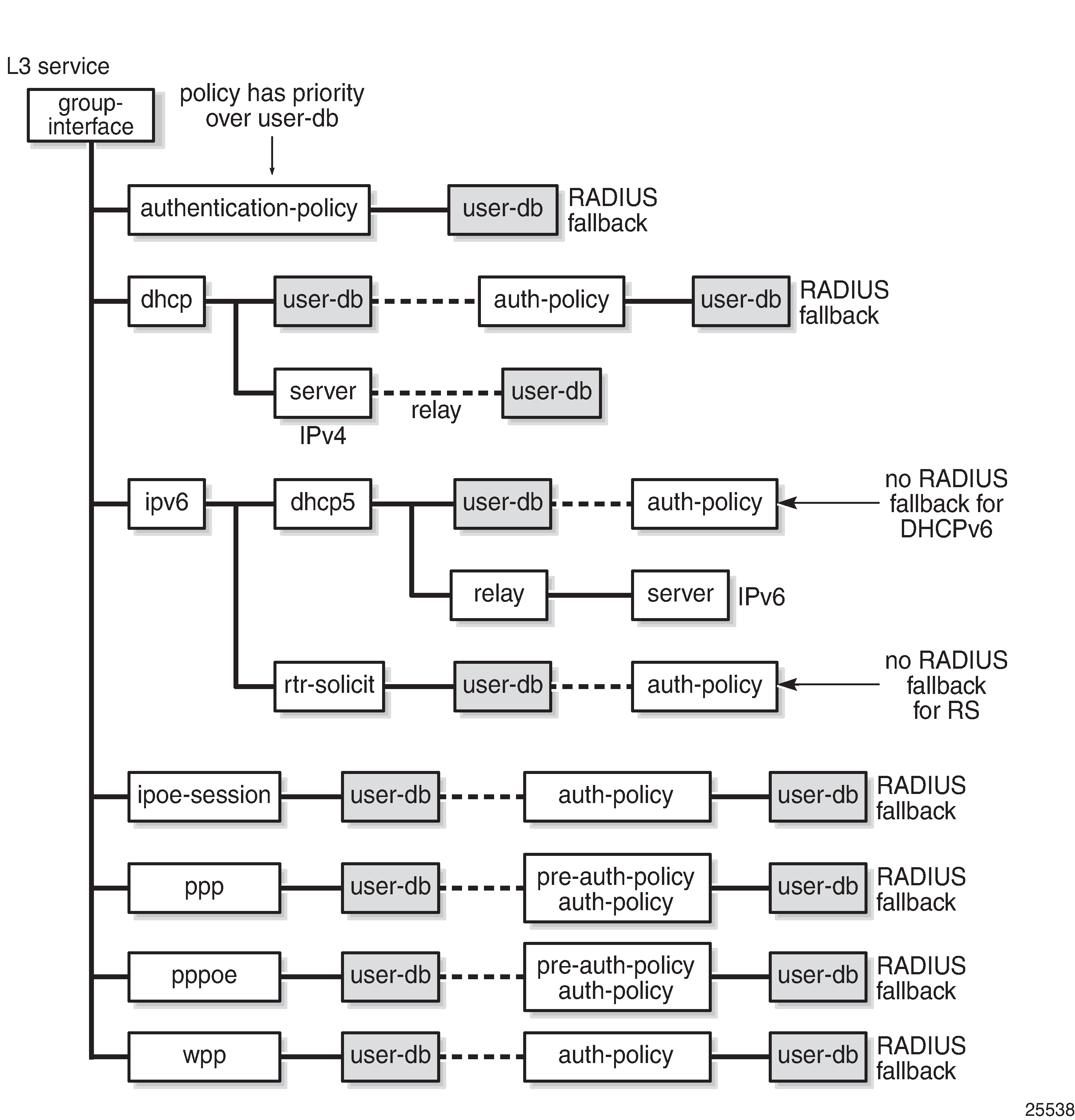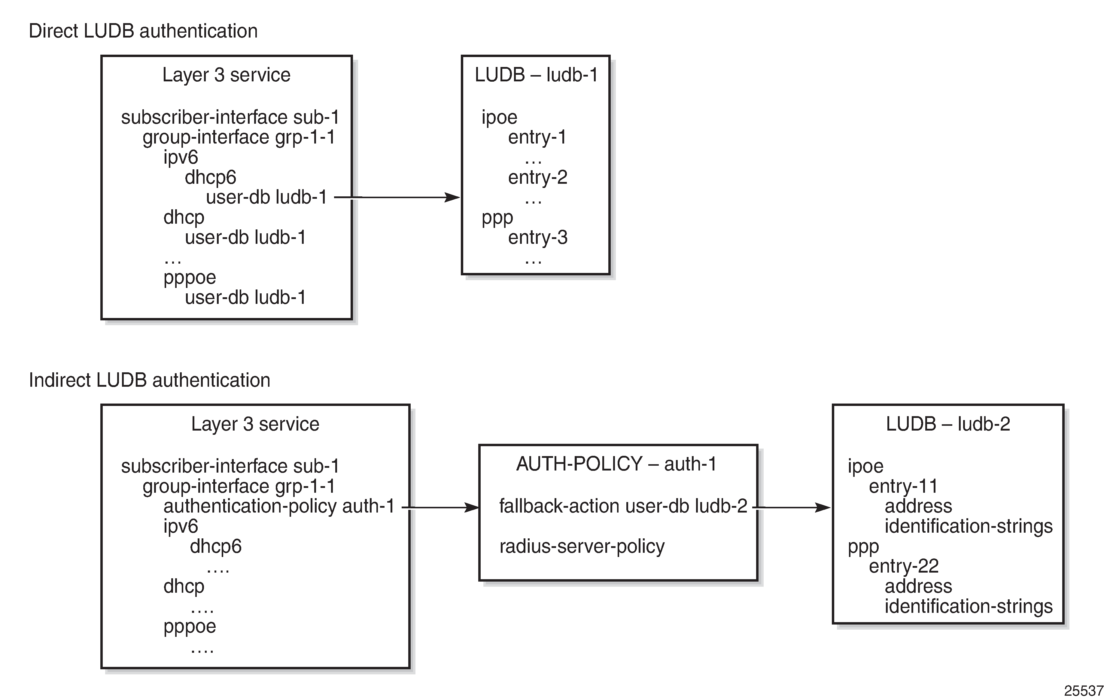 If an authentication policy is applied at the capture SAP or group interface level, that authentication policy has priority, no matter whether or in which other sub-contexts an LUDB is assigned. Only when the AAA/RADIUS server referenced from the authentication policy is not available, can the SR OS rely on a fallback LUDB if configured. In that case, only a limited set of parameters are returned; see LUDB parameters for IPoE and LUDB parameters for PPPoE.