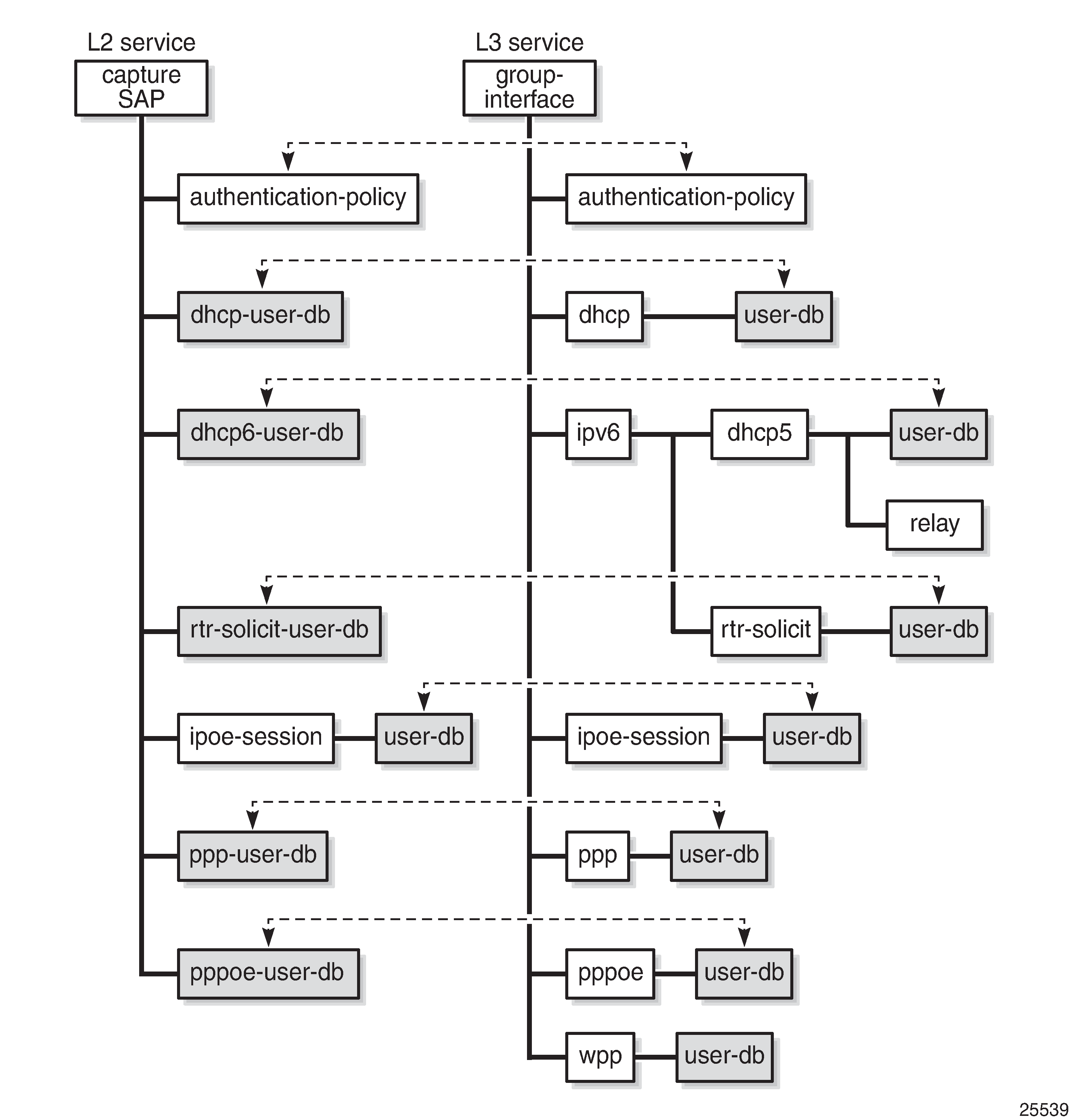 LUDB authentication for capture and managed SAPs requires an LUDB to be assigned at capture SAP level in the Layer 2 service (capture-VPLS), and at the group interface level in the Layer 3 service (VPRN or IES). Because the trigger messages to create the managed SAPs are received on the capture SAP and subsequent messages on the managed SAP, the authentication configurations for the Layer 2 and the Layer 3 service must align, including the LUDBs; see LUDB authentication for capture and managed SAPs.