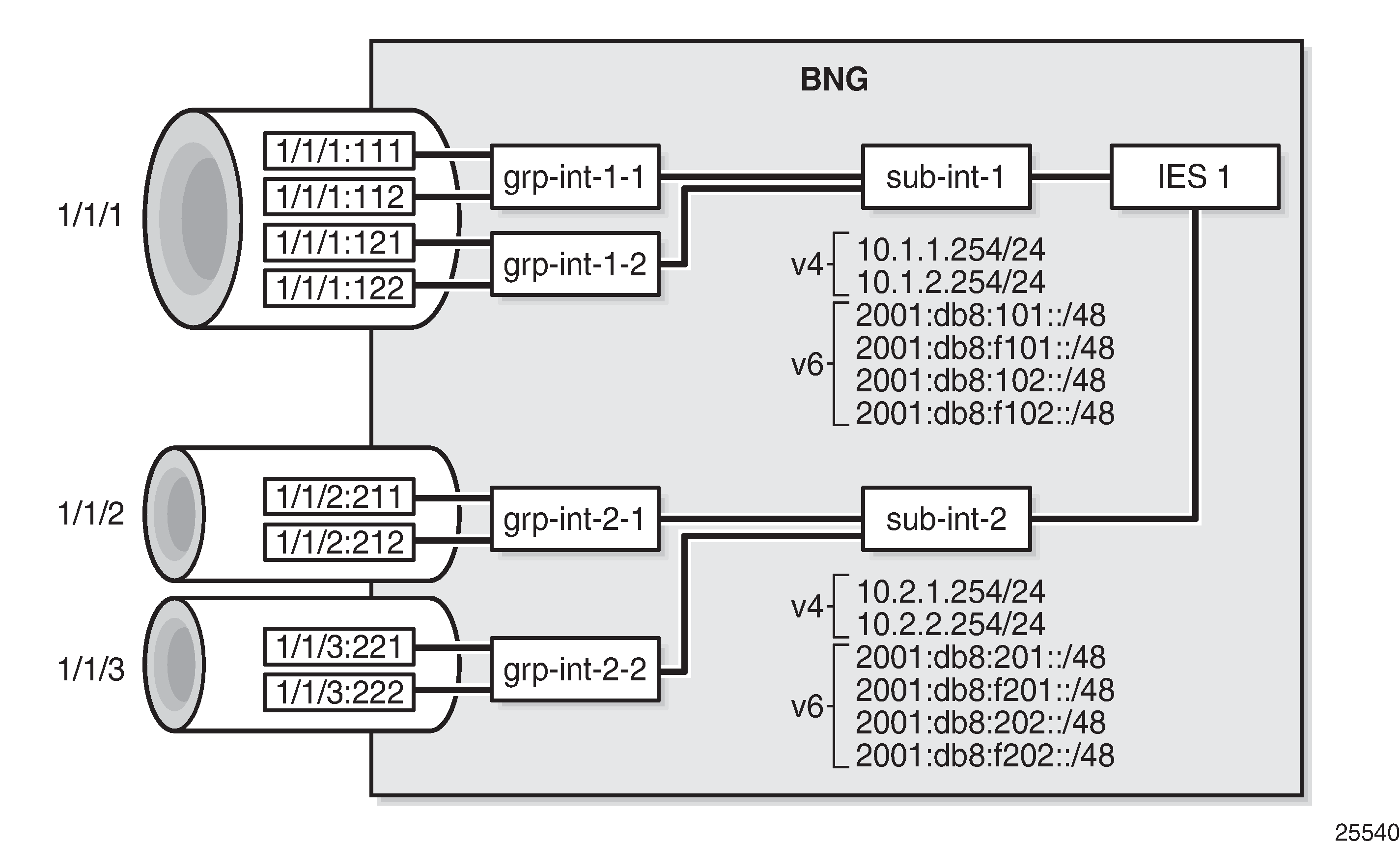 The following partial configuration applies to IES-1. This service is provisioned with ESM enabled on all of its SAPs, and supports proxy and relay scenarios on all group interfaces for both IPv4 and IPv6. Only the part relevant to subscriber interface sub-int-1 and group interface grp-int-1-1 is shown. The configurations for the other subscriber and group interfaces are similar. Check the ESM Basics and Routed CO chapters for more information.