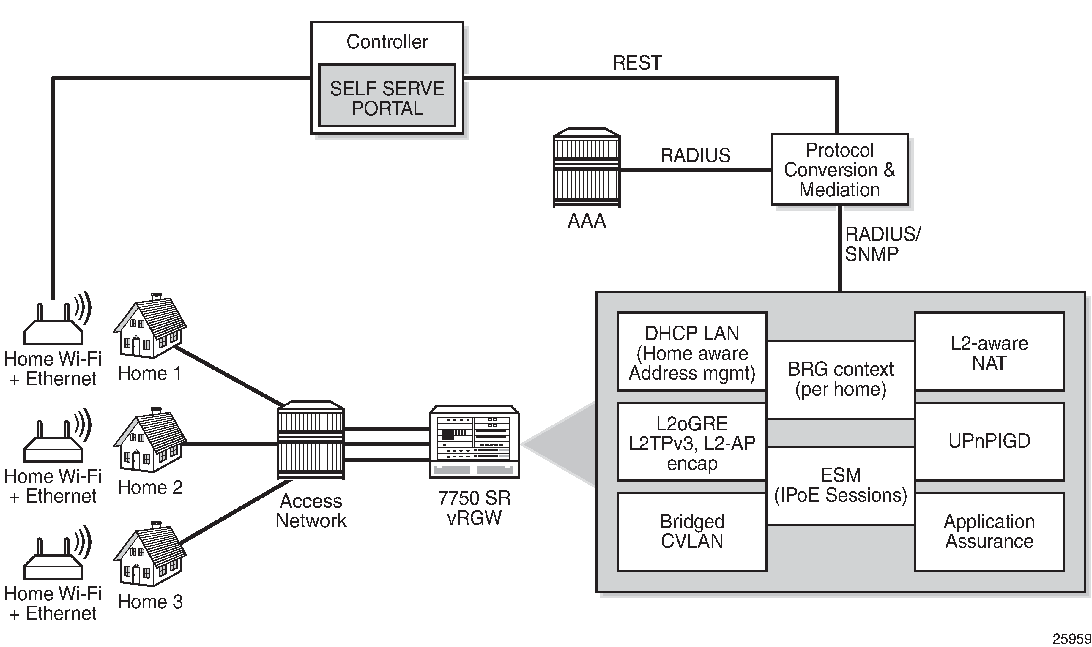 The home network can be self-managed through a service portal, where end users can connect and change home-specific settings; see BRG and home device management. The portal logic is implemented in a controlling entity providing a RESTful interface. A protocol conversion and mediation platform (PCMP) is needed to translate the RESTful interface into RADIUS (and SNMP), and vice versa. The PCMP operates in conjunction with the 5620 SAM. In the remainder of this chapter, PCMP and the controller are represented as a single component.