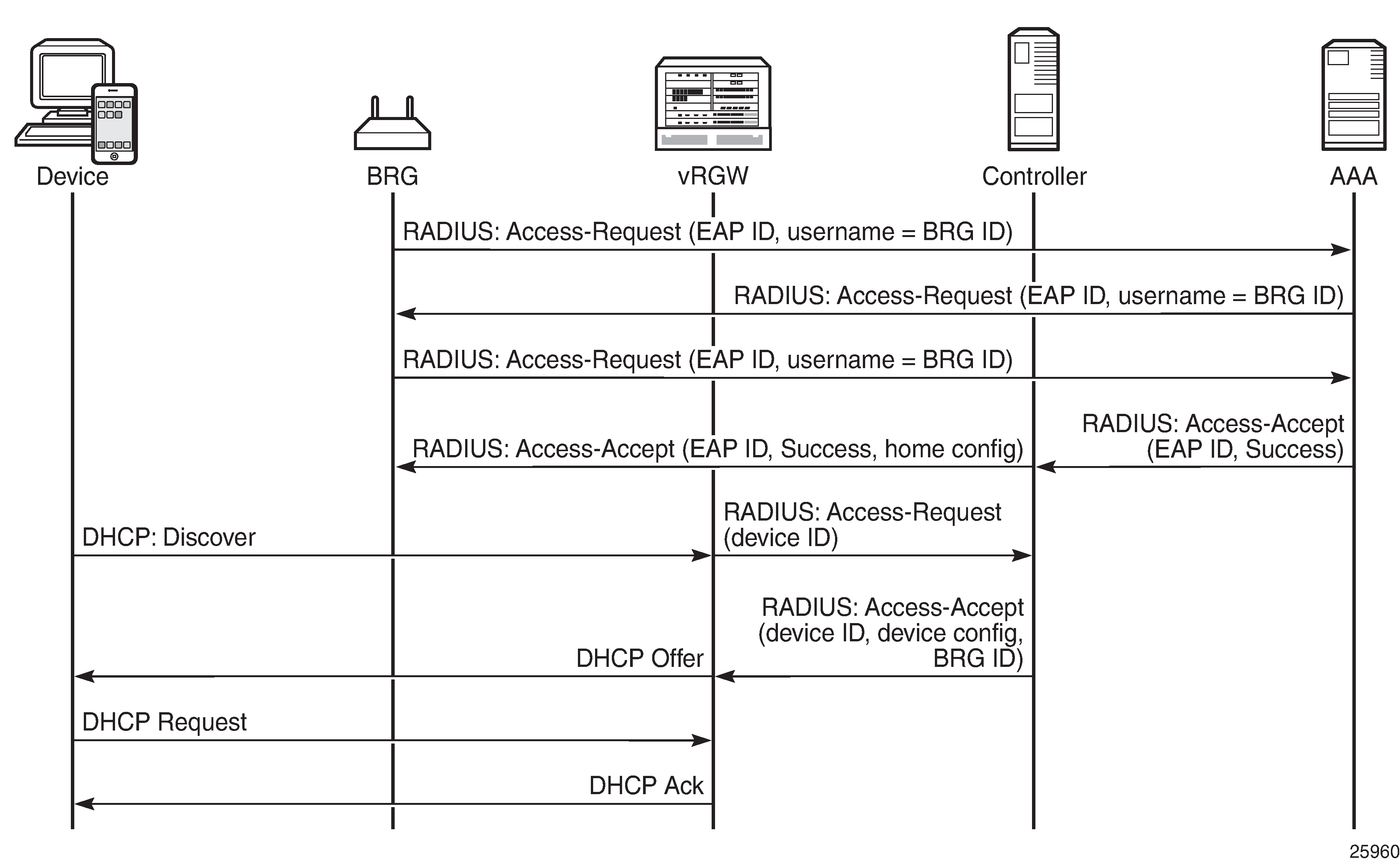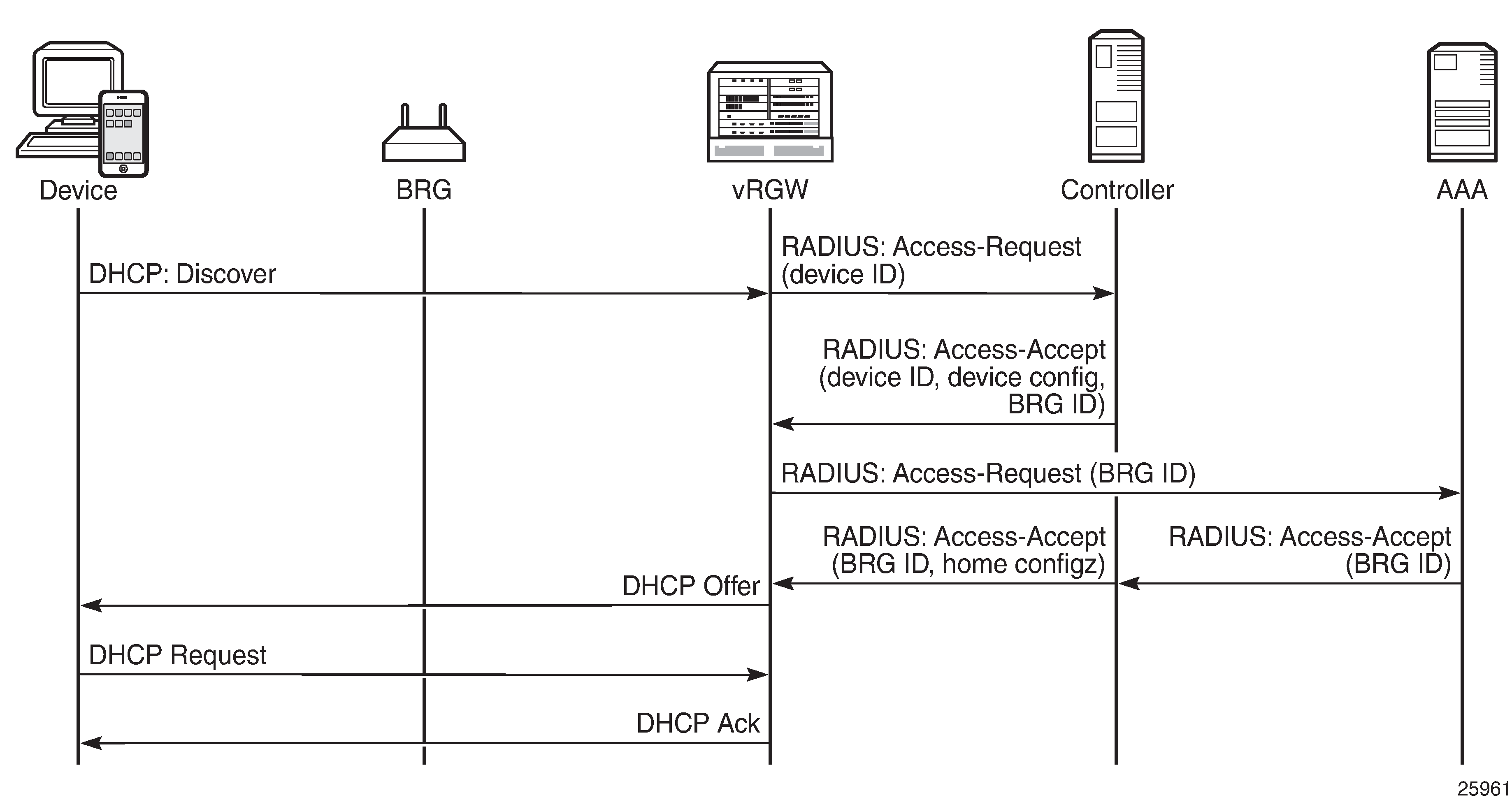 The second phase starts with the Discover message of a typical Discover-Offer-Request-Ack (DORA) message sequence. The vRGW then initiates device authentication toward the controller, which returns the BRG ID and, optionally, device-specific configuration data in an Access-Accept message. The controller usually will not proxy device authentication toward the AAA server. Typically, the RADIUS protocol is used between the vRGW and the controller. As such, the vRGW will send an Access-Request message to the controller for every new device, including static devices, to get the per-device configuration.
