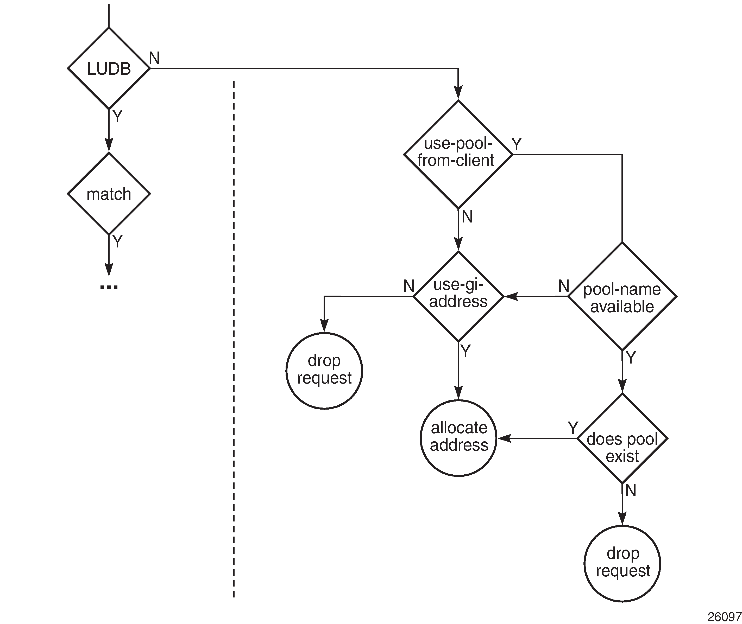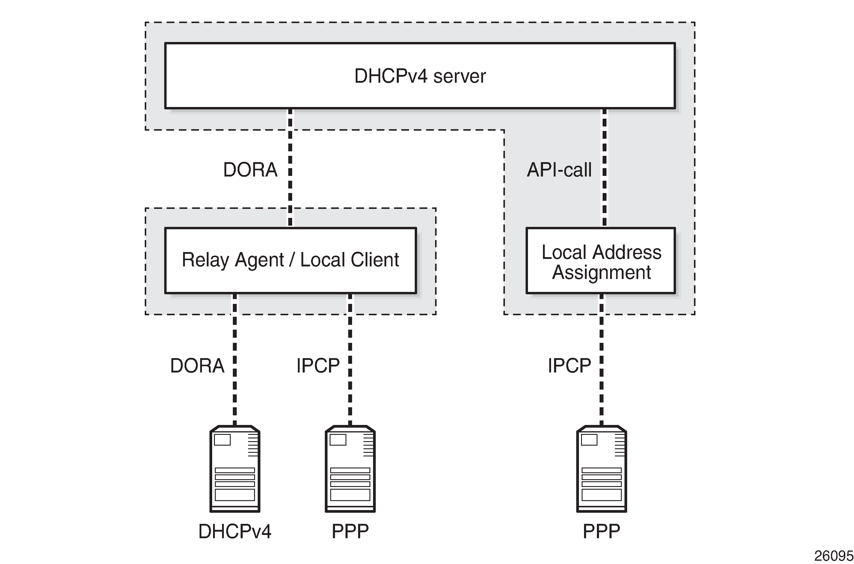 When a PPP user connects through LCP and IPCP on a service with an internal DHCP client (local client) configured, the local client manages the DORA communication toward the DHCP server, if the relay agent also has relaying enabled for PPP applications. The local client and the DHCP server can be located in the same or in a different (remote) node.