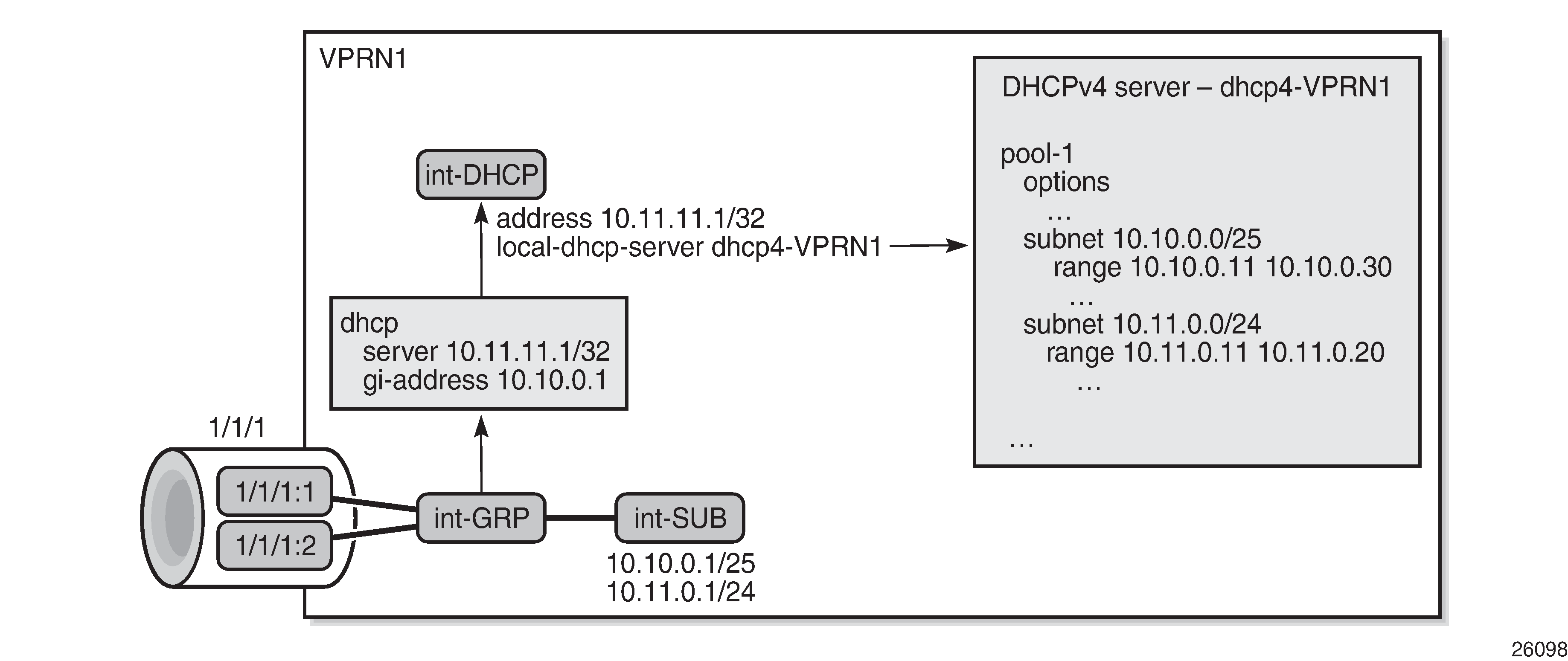 A DHCP server can be used for IPoE users and PPP users simultaneously. A DHCP server must be hosted by a VPRN service or the base router. It can be accessed in either of the following ways; see Accessing a DHCP server: