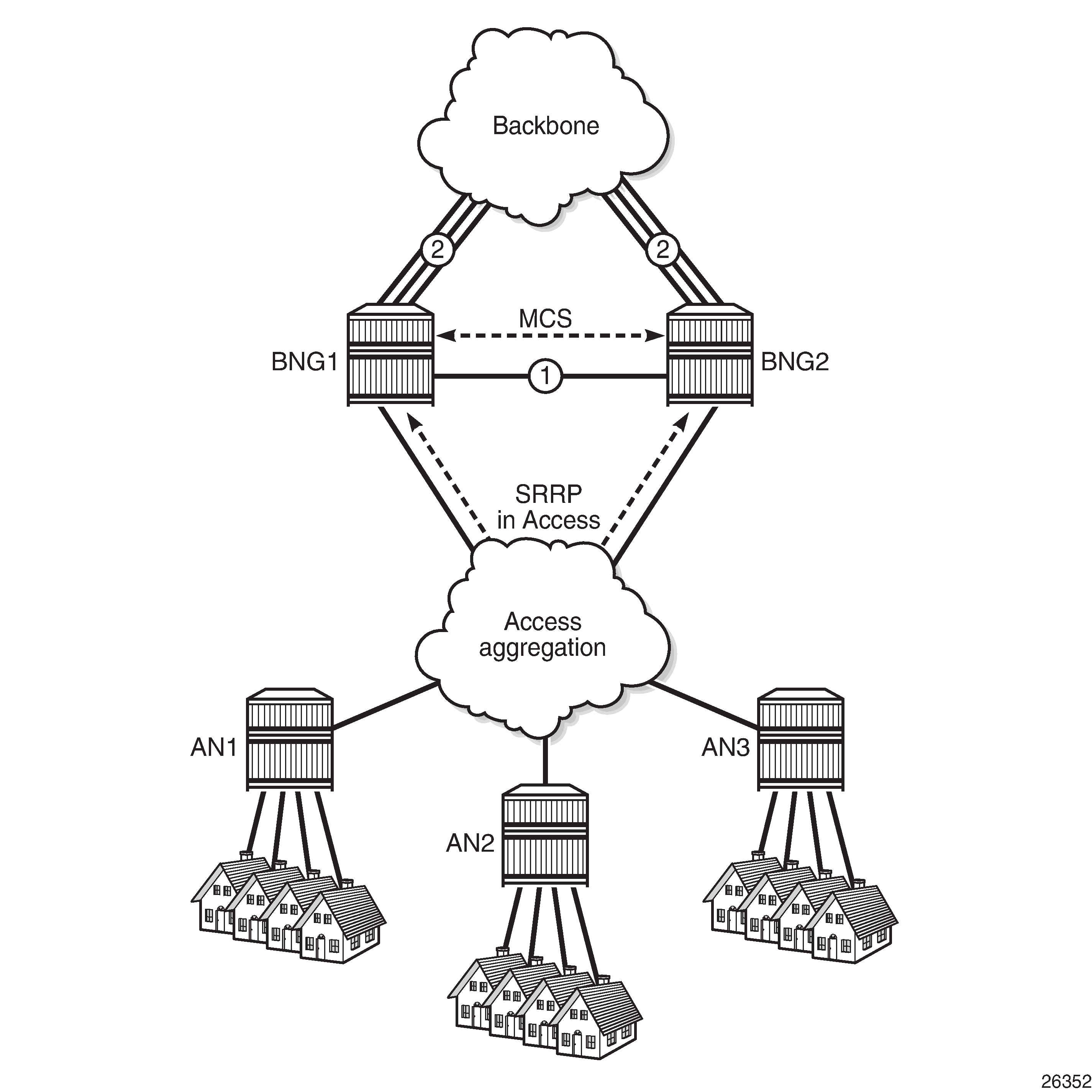 General Redundancy Model shows the general redundancy model, where clients connected to the Layer 2 access nodes AN1, AN2, and AN3 get their addresses from the DHCP servers located in BNG1 and BNG2, via relay agents that are also located in BNG1 and BNG2. Access network redundancy can be supported through the Subscriber Routed Redundancy protocol (SRRP) or through Multi Chassis Link Aggregation (MC-LAG) in combination with SRRP.