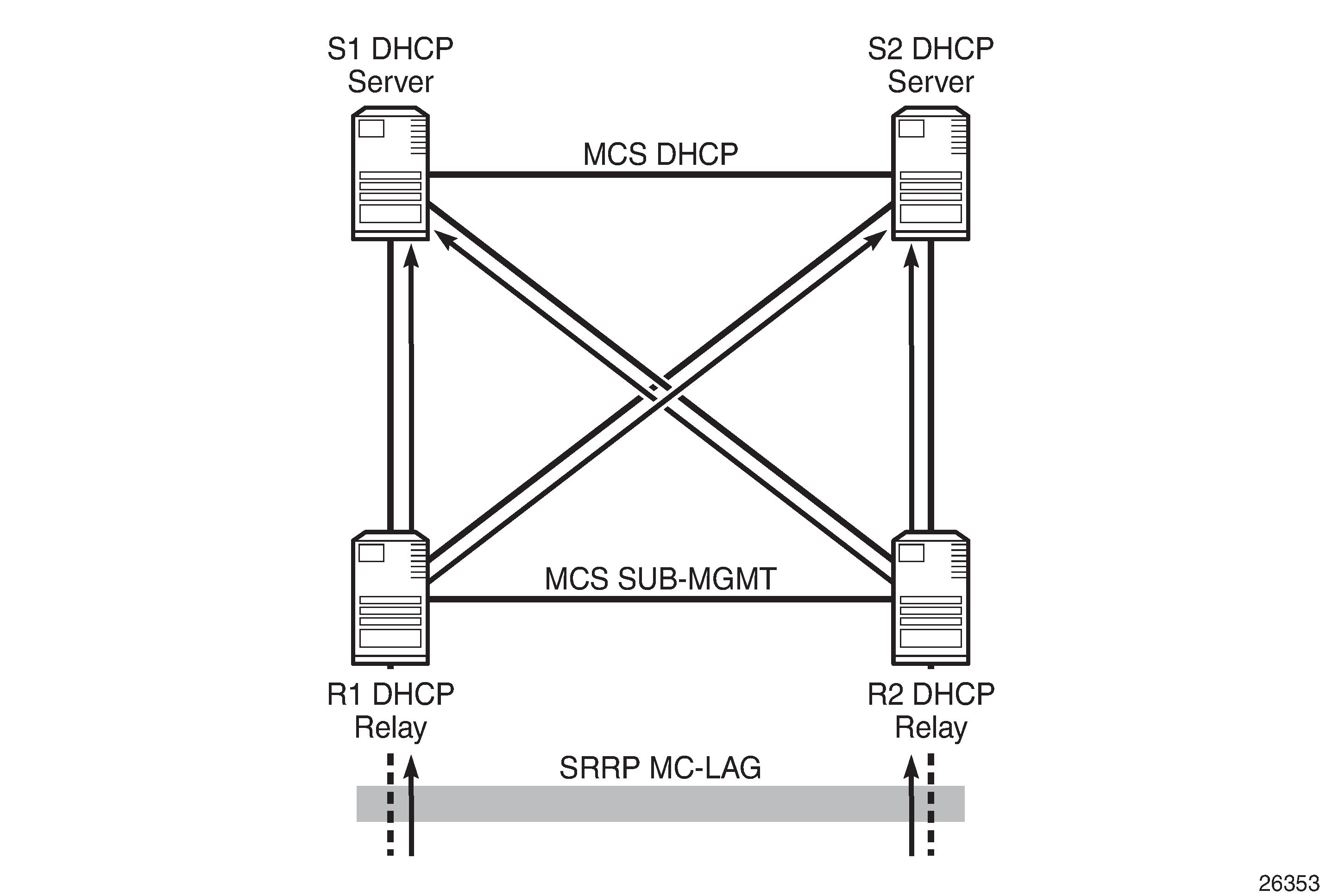 DHCP Relay Agent and Server Redundancy Model shows the DHCP relay agent and server redundancy model, where the DHCP relay agents R1 and R2 and the DHCP servers S1 and S2 are situated in different nodes in the network. DHCP requests received from the access network are relayed onto S1 and S2 via R1 and R2. MCS is used for synchronizing the lease database between servers S1 and S2. MCS can also be used for synchronizing the subscriber management information between R1 and R2, but that is out of the scope of this chapter.