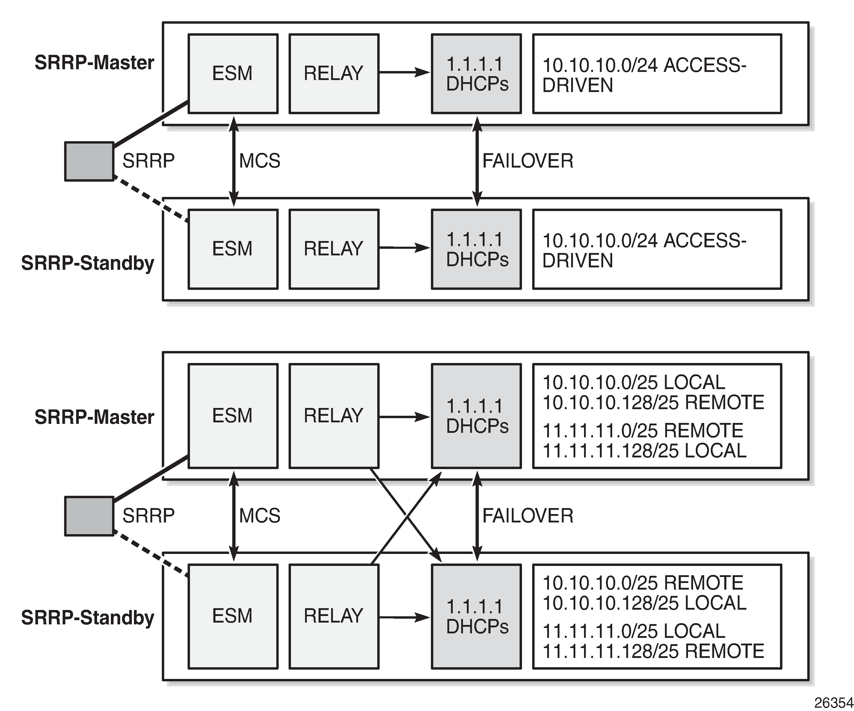 In the access-driven model, the address ranges on both DHCP servers are defined as access-driven. As for the topology, the relay agents are configured to relay the messages to and from one server only, and Nokia recommends that both DHCP servers use the same interface address. This can be achieved by hosting the ESM, relay, and DHCP server functionalities in the same router.