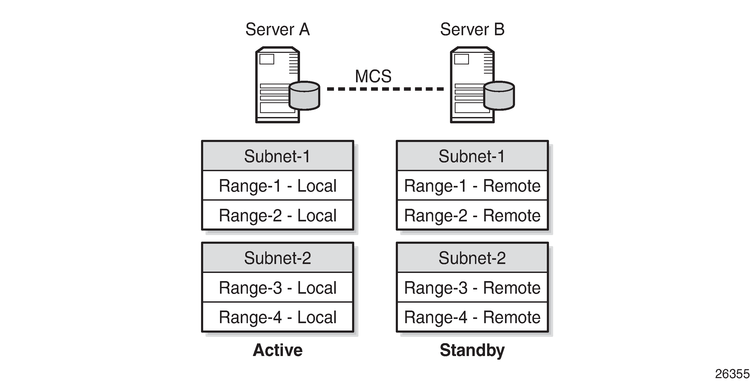 The standby DHCP server synchronizes with the active server through MCS, so it can take over all ranges of all subnets in case of a failure. Addresses from the remote ranges are managed only in case the server is in the partner down state.