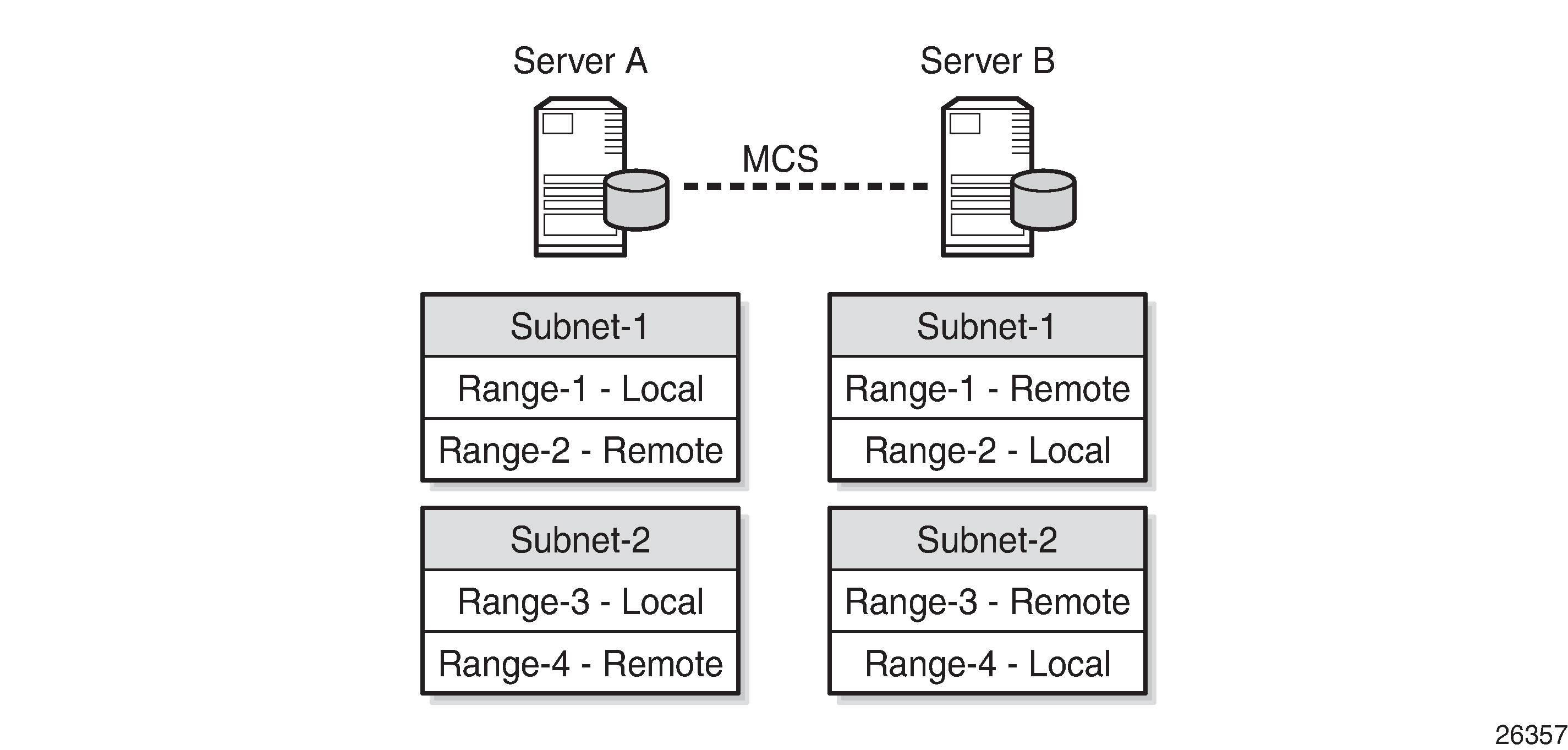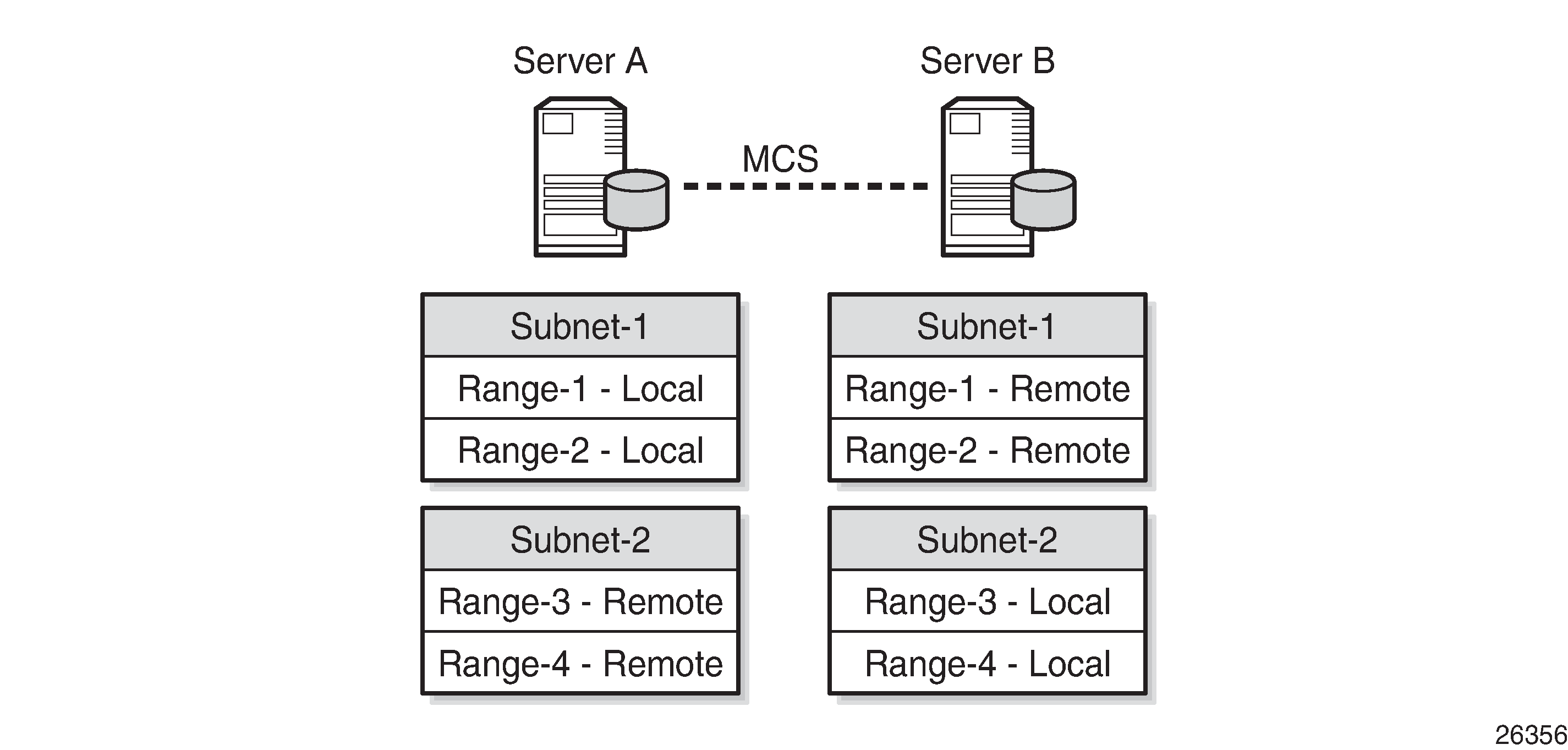 The second example of the local-remote model is a load sharing configuration; see Local-Remote Model – Subnet-Based Load Sharing. All subnet-1 ranges are declared local on server A, and remote on server B. For subnet-2, this is the opposite.
