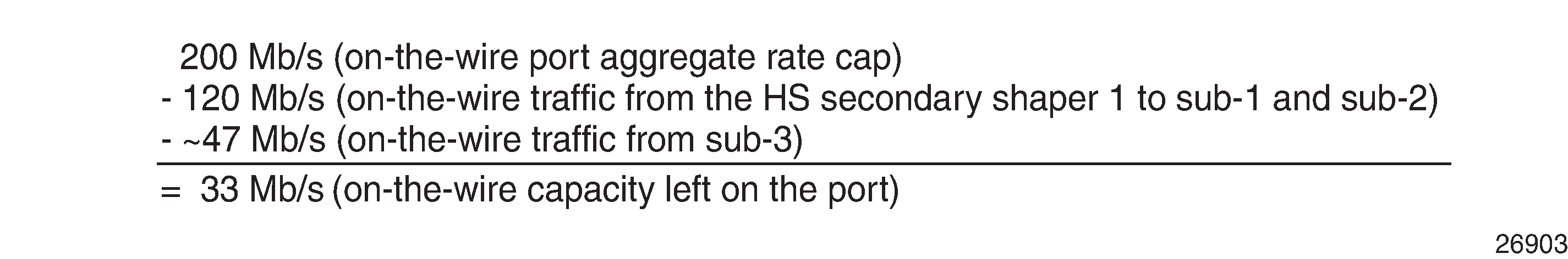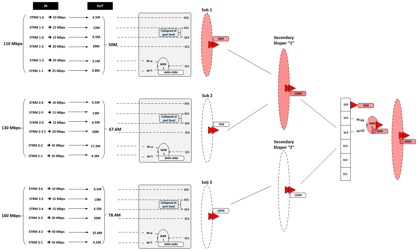 Similar logic can be used for traffic on scheduling classes 2 and 1 for sub-3. The difference from the previous case is that this traffic will be limited by port congestion and not the HS secondary shaper congestion (or subscriber aggregate congestion).