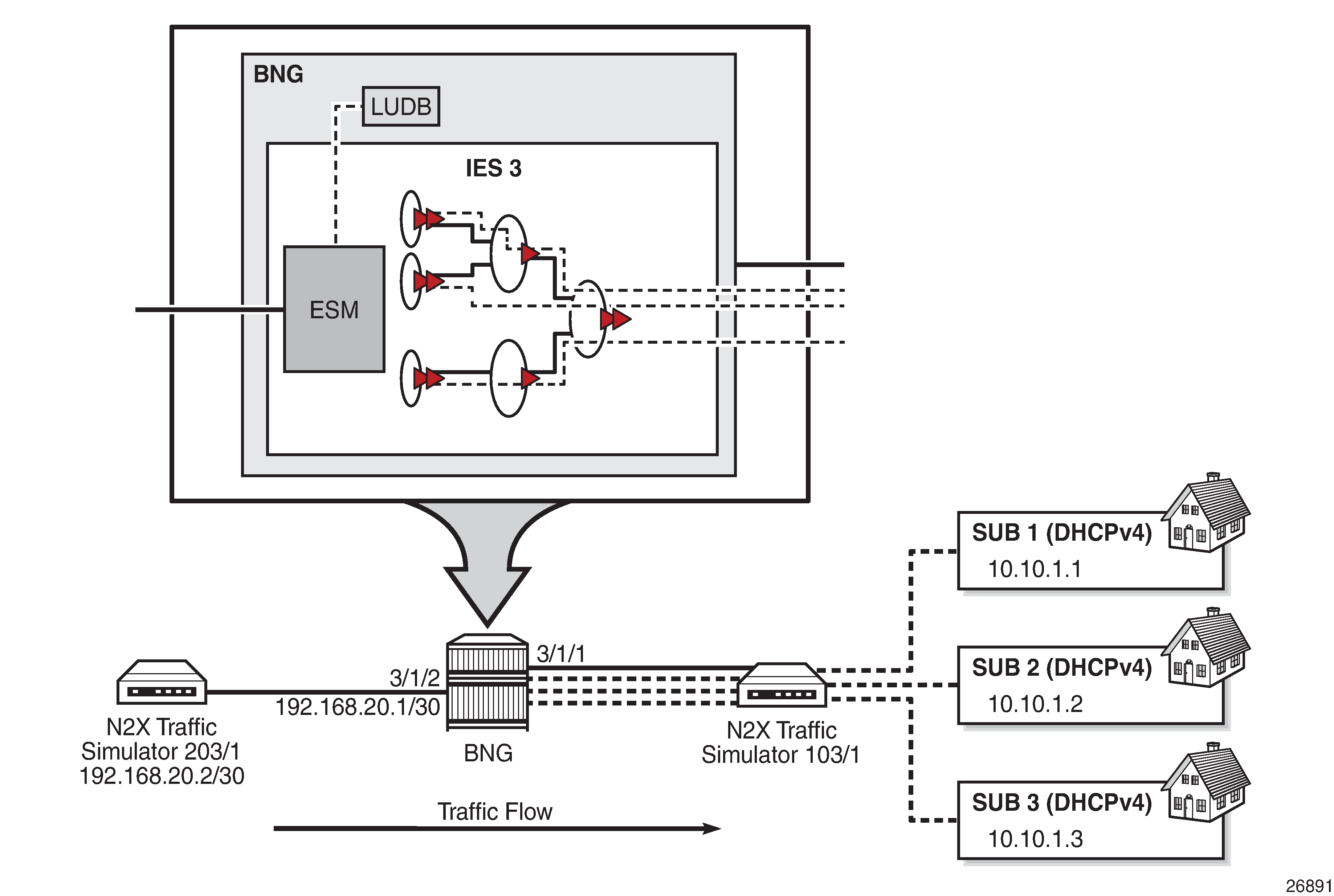 DHCPv4 traffic (simulated subscriber hosts) is initiated from port 103/1 on a traffic generator. Subscribers are authenticated via local user database (LUDB) and instantiated on managed SAPs (MSAPs) in the IES 3 service. Subscriber IP addresses are assigned statically via LUDB.