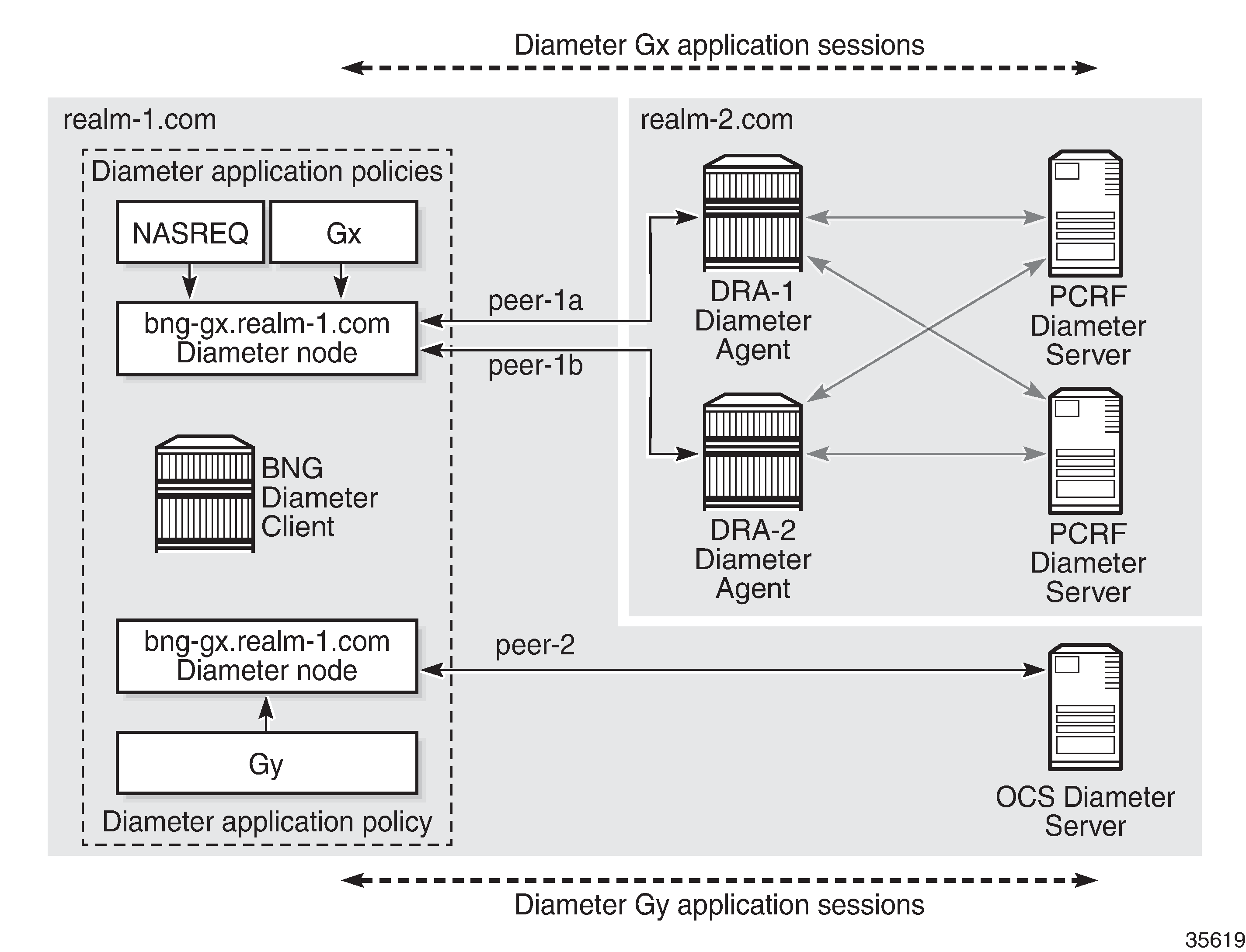 A Diameter Client (BNG) is connected via peer-1a and peer-1b to two Diameter Agents (DRA-1 and DRA-2) that provide connectivity to the Diameter Application Servers (PCRF). Via these peers, the BNG can authenticate and perform policy control of subscriber sessions using the NASREQ and Gx applications. The same Diameter Client (BNG) is also directly connected to another Diameter Application Server (OCS) via peer-2. Via this peer, on-line charging can be done for the subscriber sessions using the Gy application.