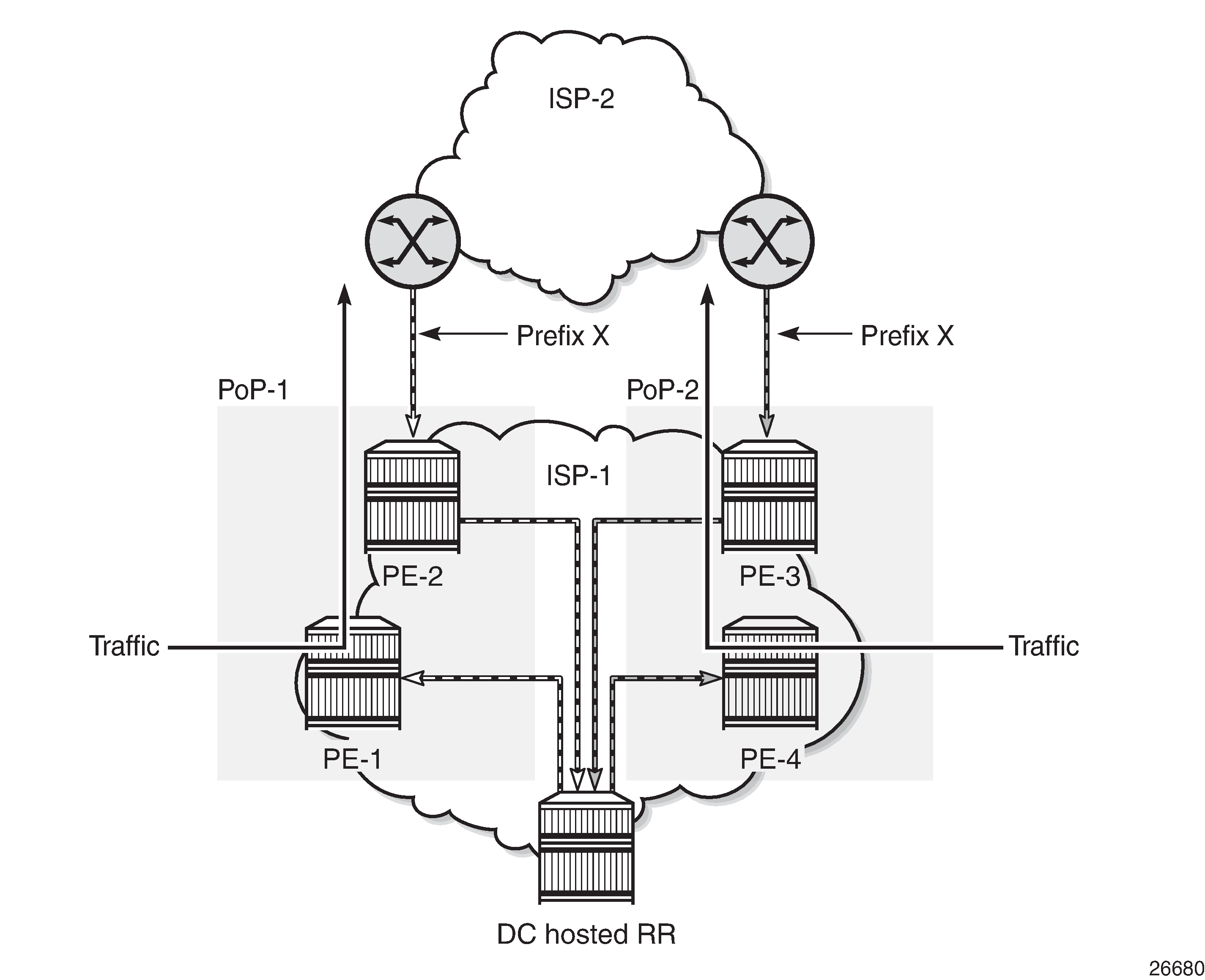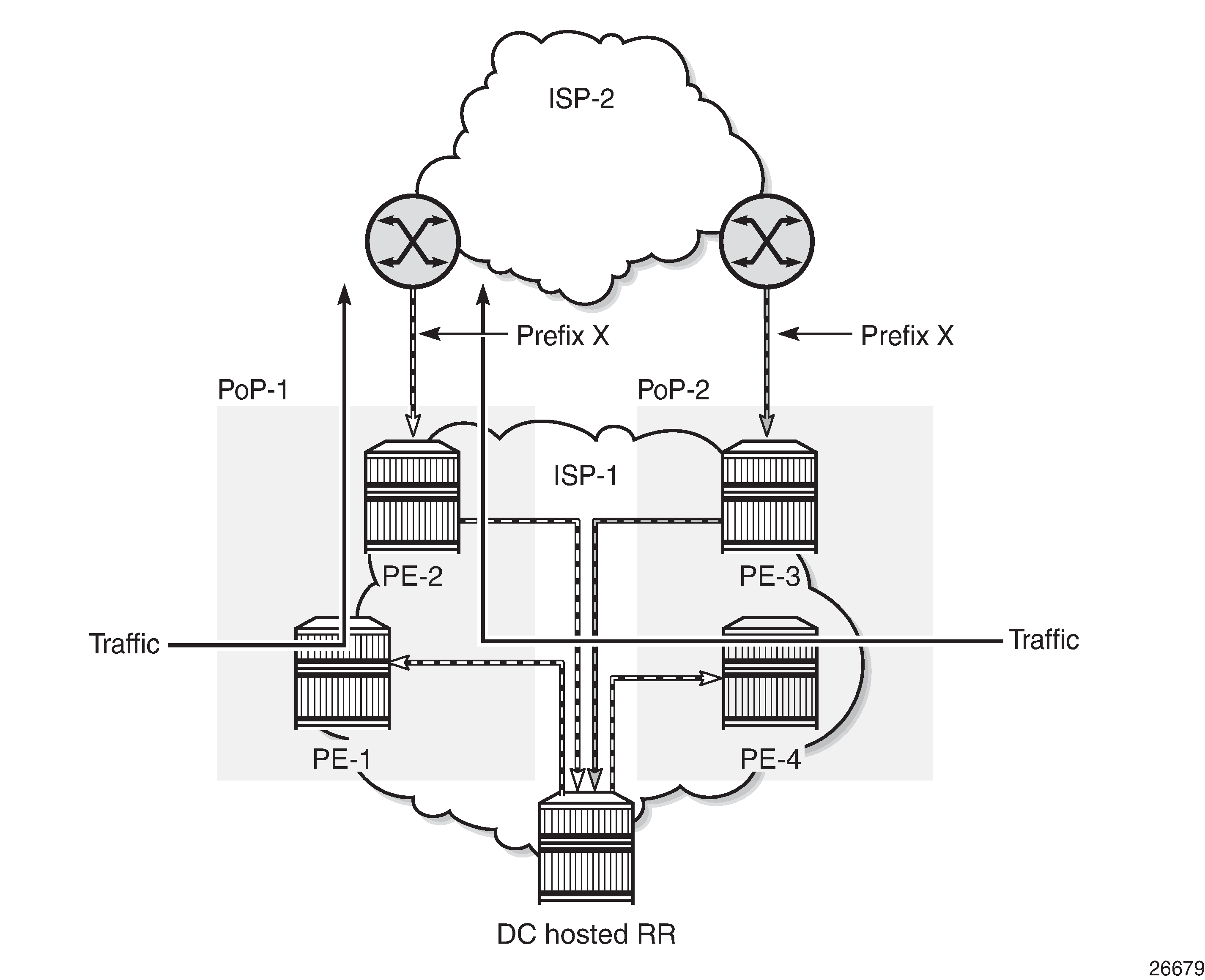 When a BGP route reflector receives multiple paths for the same IP destination, it normally selects and reflects a single best path in its routing domain to all clients in that domain, based on its own location in the domain. In Centralized route reflection, the centralized route reflector RR for ISP-1 is located in the datacenter (DC), and receives prefix X from ISP-2 through PE-2 in point of presence PoP-1 and also through PE-3 in PoP-2. RR selects and reflects PE-2 as the best path to the remaining route reflector clients because RR is closer to PoP-1 than it is to PoP-2, so the traffic to destination X flows as indicated. Therefore, sending traffic to another autonomous system (AS) through the closest possible exit point from the local AS, known as hot-potato routing, cannot be achieved.