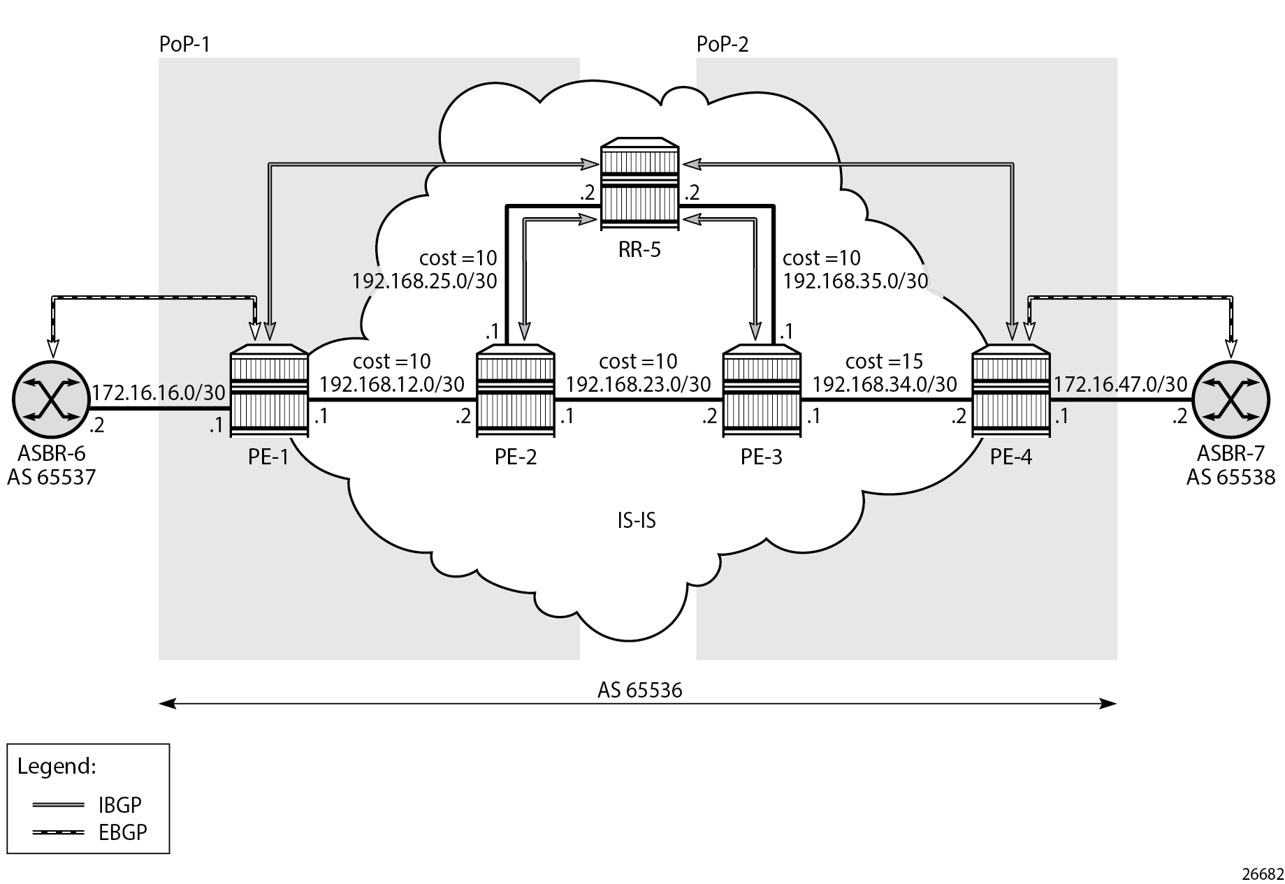 IS-IS as IGP on all interfaces within AS 65536, in a non-hierarchical way (alternatively, OSPF can be used), and traffic engineering enabled