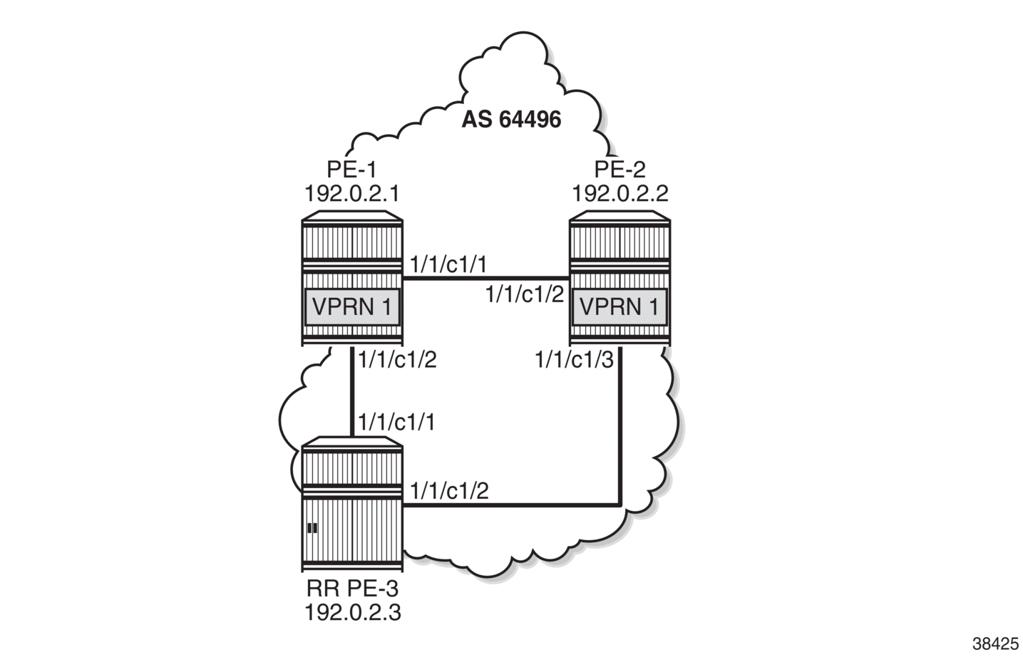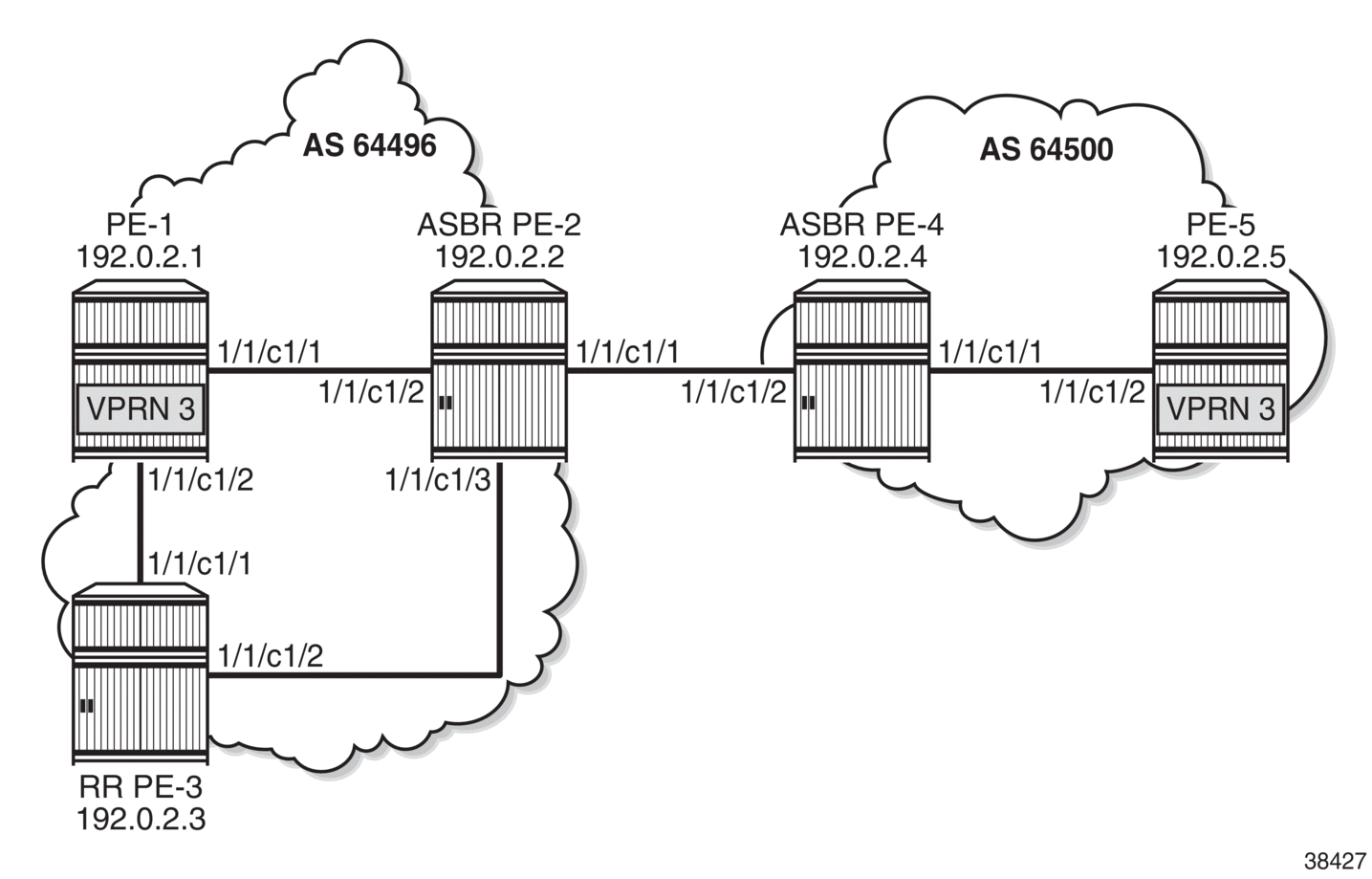 VPRN 3 - inter-AS VPRN model C shows the example topology with RR PE-3 in AS 64496. VPRN 3 is configured on PE-1 and PE-5.
