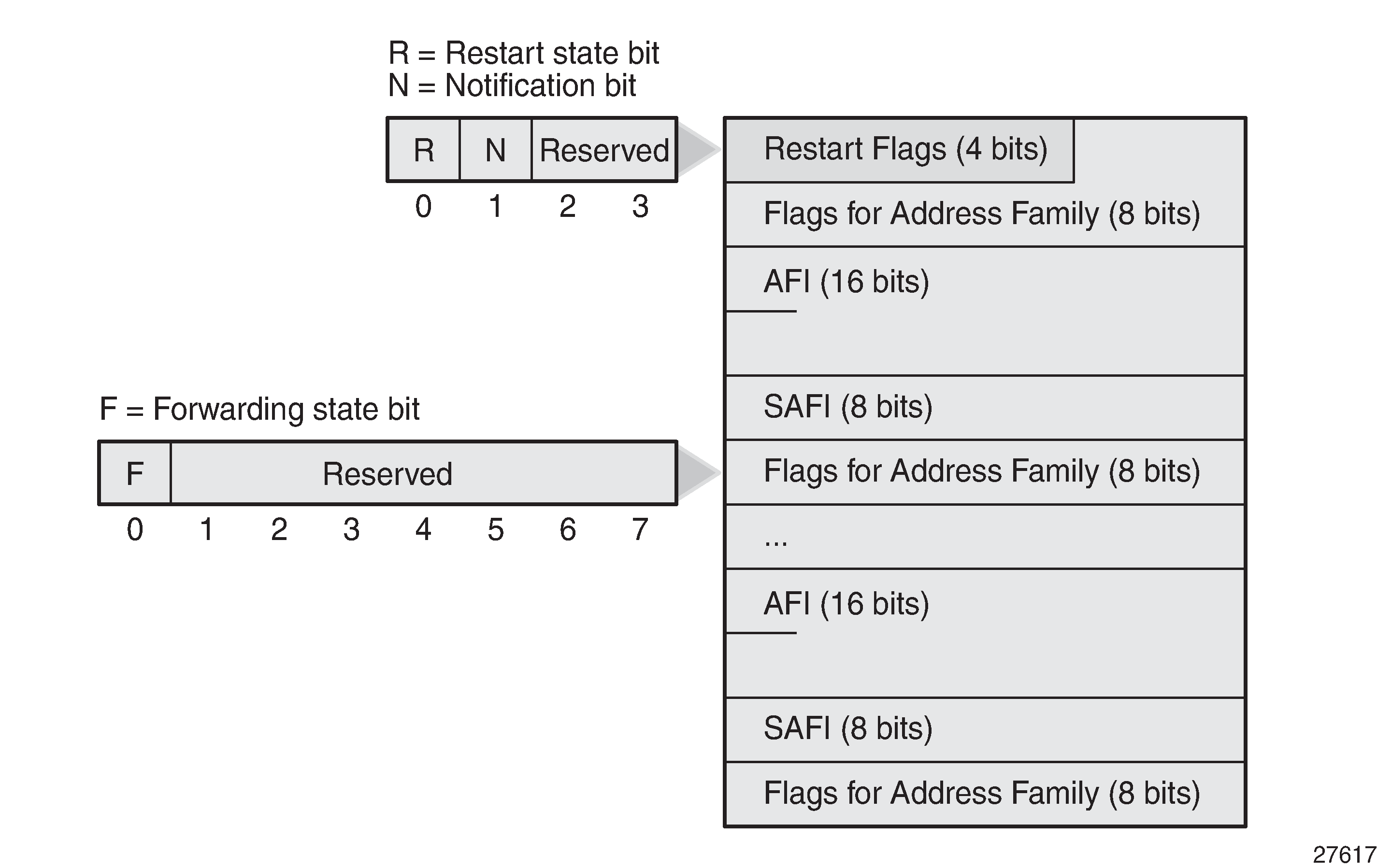 The restart state bit R is used to avoid a possible deadlock when multiple BGP speakers peering with each other restart simultaneously and are waiting for the EOR. When set (R=1), the bit indicates that the BGP speaker has restarted and its peer must not wait for the EOR before advertising routing information.