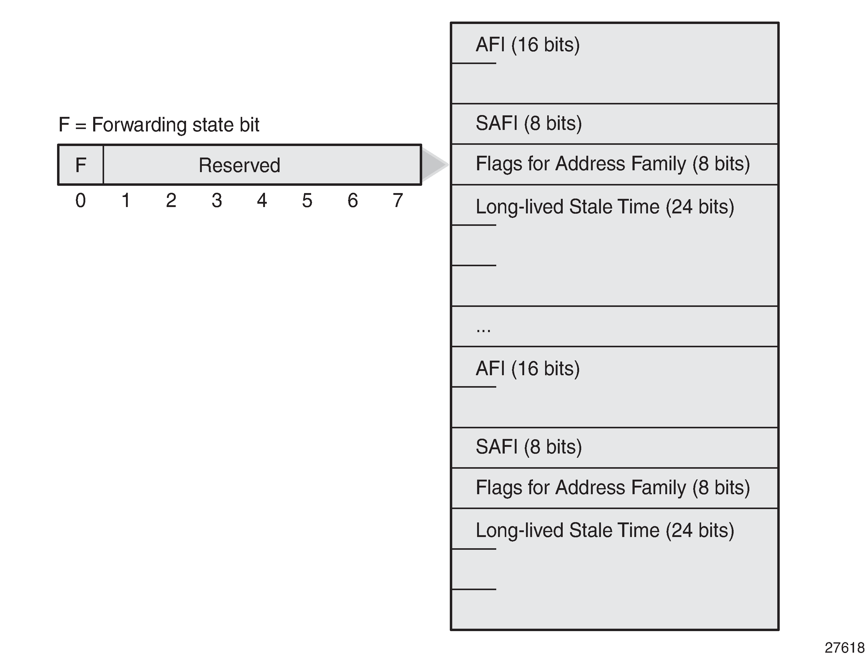 The forwarding state bit F indicates whether the forwarding state for routes with a certain AFI/SAFI are preserved during BGP restart. When set (F=1), the forwarding state is preserved. After a hard reset caused by a BGP Notification Cease message, the forwarding bit must be set to 1.