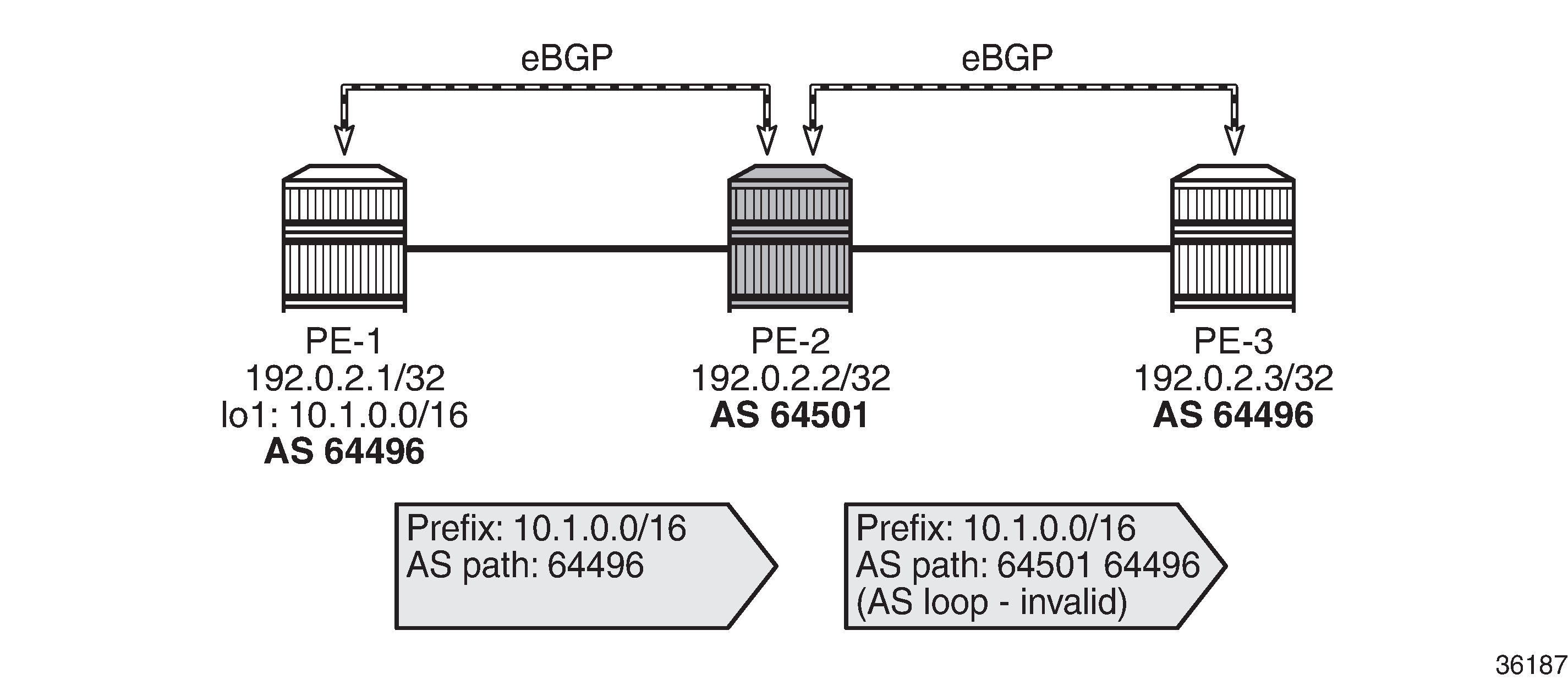 This type of interconnectivity creates a problem because a BGP route originated by one of the sites and propagated through the backbone will appear as an AS path loop when advertised into another site. Routes with an AS loop are invalid; PE-2 detects AS-path loop and advertises the route to PE-3 as invalid shows an example. PE-2 in AS 64501 receives a BGP route from PE-1 in AS 64496. PE-2 detects that the ASN 64496 in the BGP AS-path attribute equals the ASN of its peer PE-3, so it detects an AS loop and advertises this route to PE-3 as an invalid route.