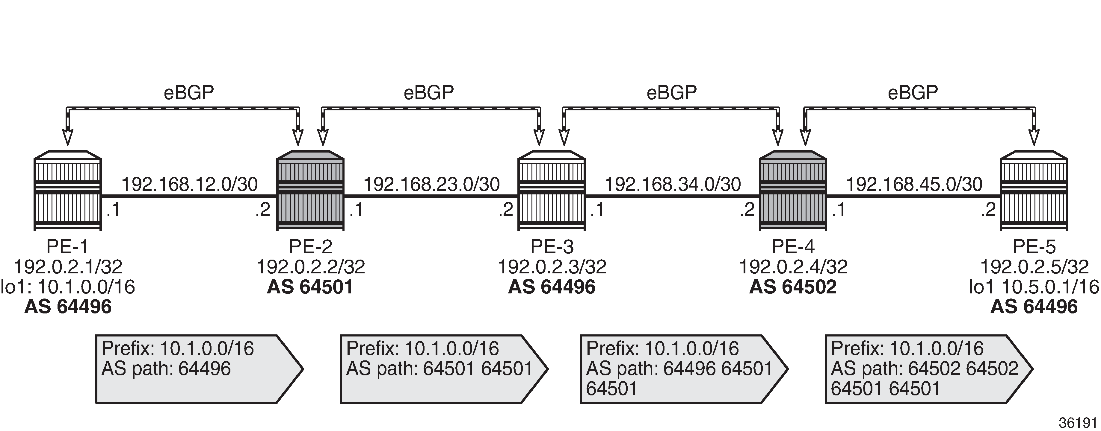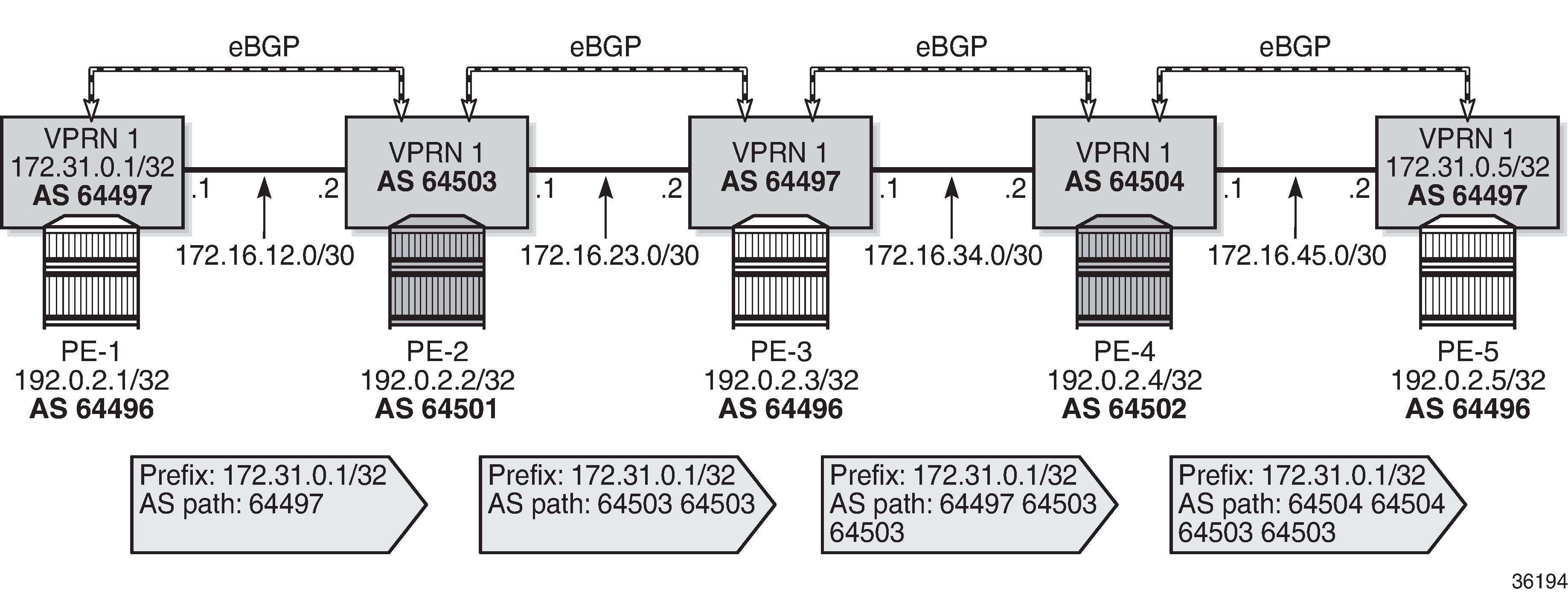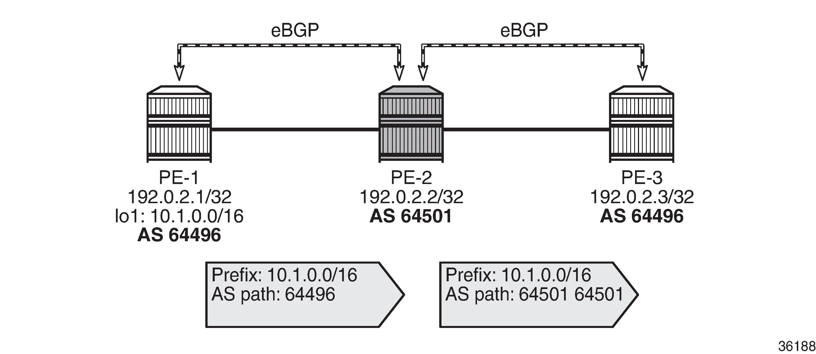Most operators prefer to use BGP AS override. A router configured to use BGP AS override on a BGP session monitors outbound routes toward that peer. Whenever a route has the ASN of the peer in its AS-path, all occurrences of this ASN are replaced by the local ASN of the router (or its confederation ID, if the peer is outside the confederation). BGP AS override replaces the peer ASN in the AS-path with the local ASN shows that PE-2 has replaced ASN 64496 in the AS-path attribute of the BGP route toward PE-3 with its own ASN 64501.