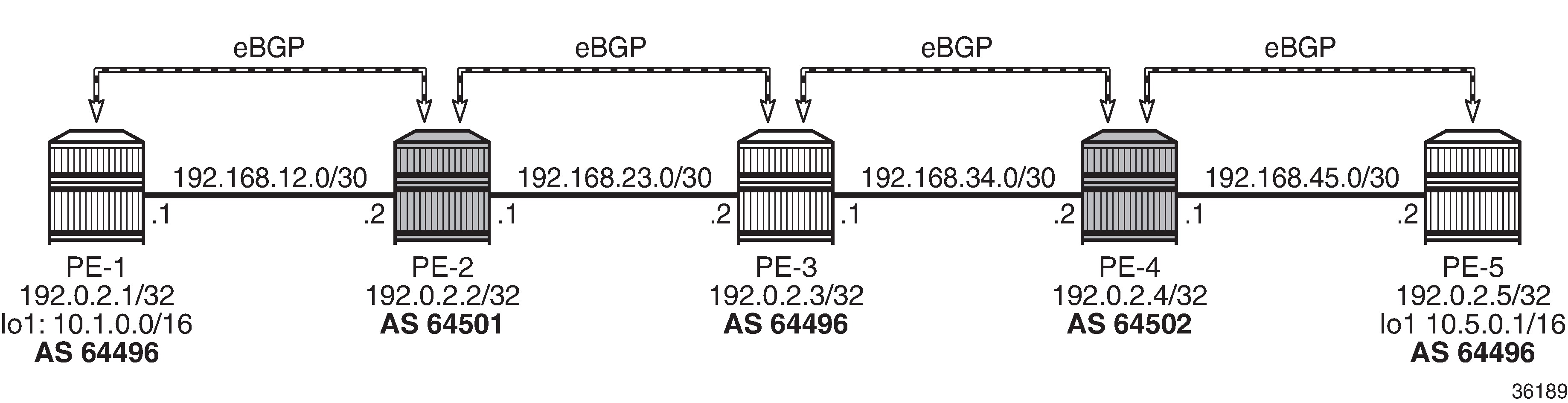 Example topology shows the example topology with five routers: PE-1, PE-3, and PE-5 in AS 64496, PE-2 in AS 64501, and PE-4 in AS 64502.