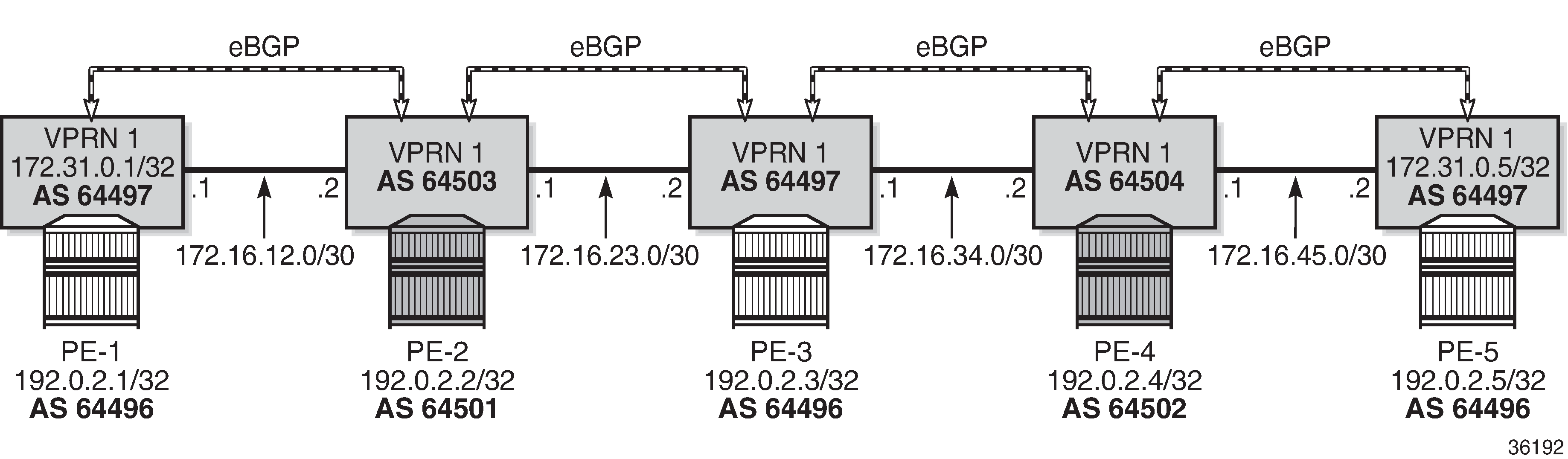 The service configuration on the other nodes is similar. The IP addresses and ASNs are shown in Example topology with VPRN 1 on all PEs.