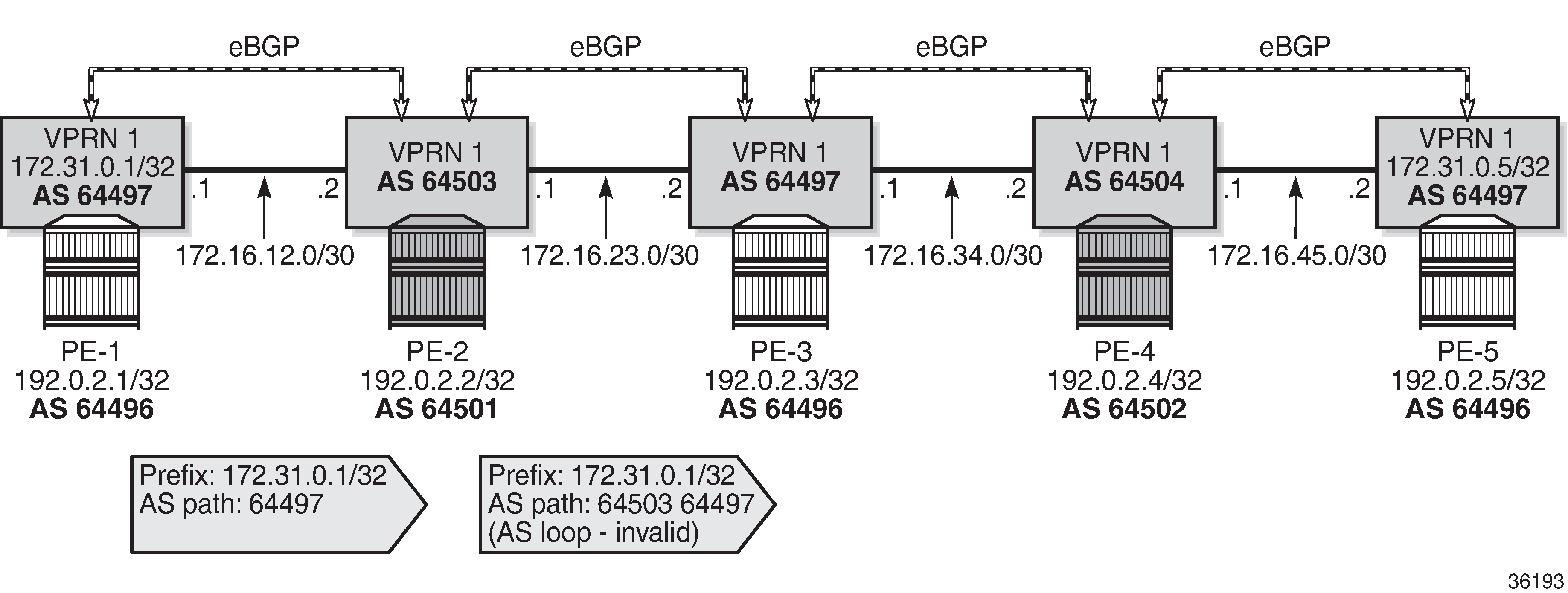 ASN 64497 equals the peer AS of PE-3, so an AS loop is detected, and the following route is advertised to VPRN 1 on PE-3 as invalid: