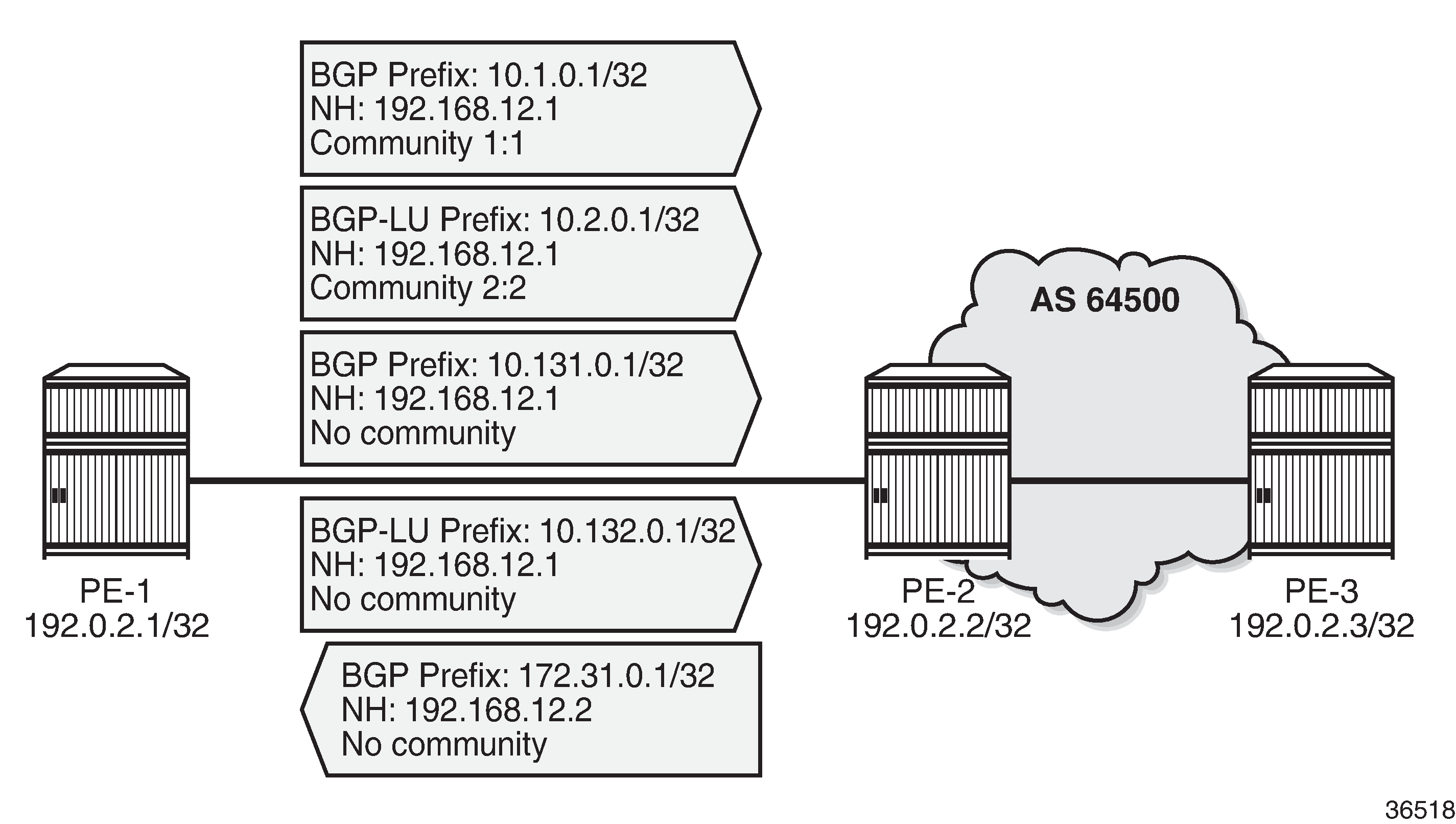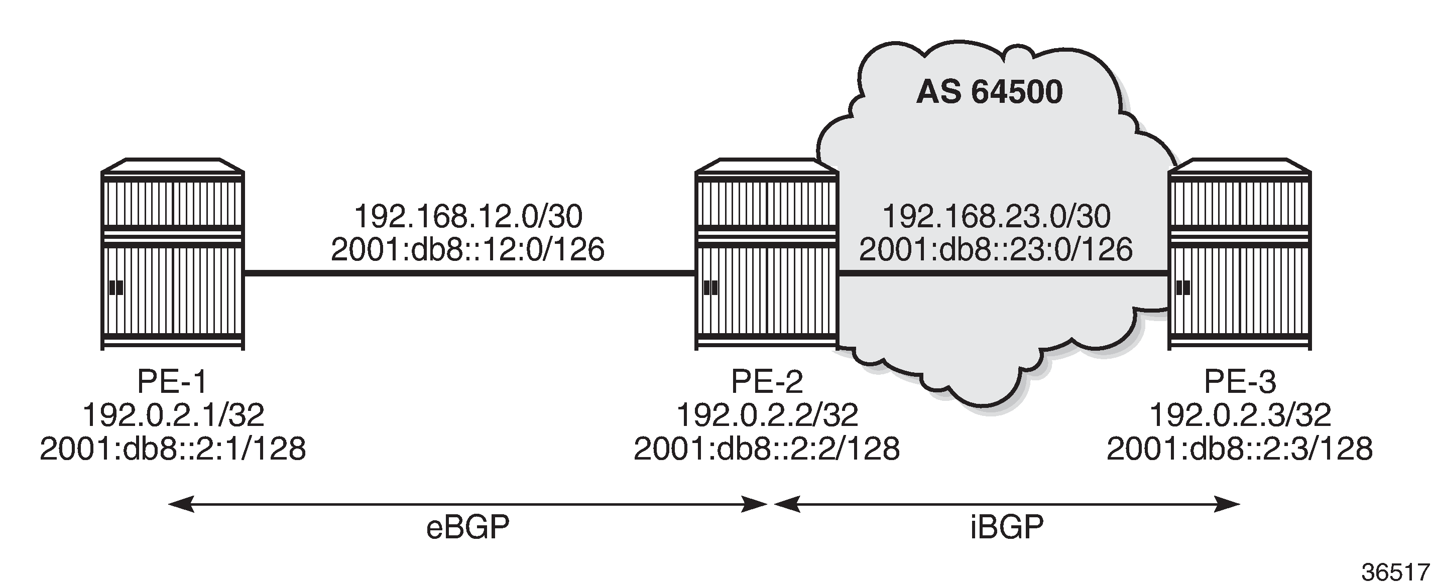 Example topology shows the example topology with three nodes. An eBGP session is established between PE-1 and PE-2; an iBGP session between PE-2 and PE-3.