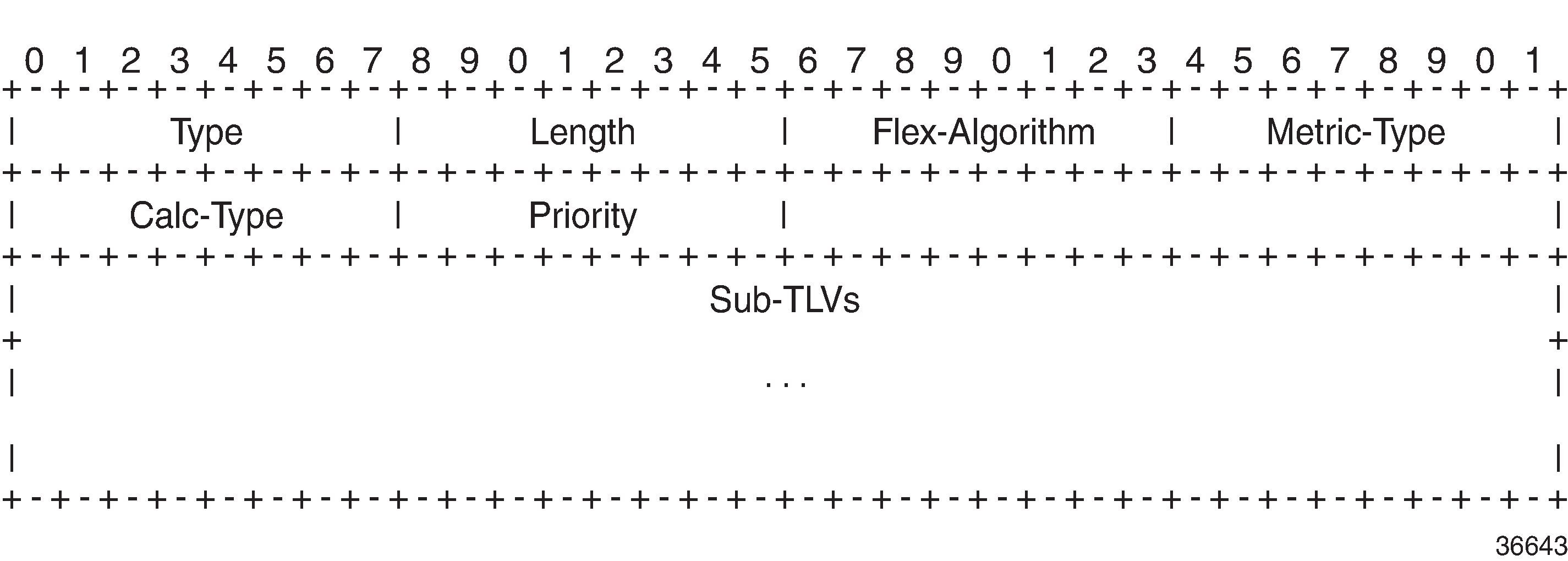 To guarantee loop-free forwarding for paths computed with a Flex-Algorithm, all routers that participate in that Flex-Algorithm must receive the definition of it. In IS-IS, the definition of the Flex-Algorithm is advertised using the FAD sub-TLV, which is a sub-TLV of the Router Capability TLV and has area scope, as shown in IS-IS FAD sub-TLV.