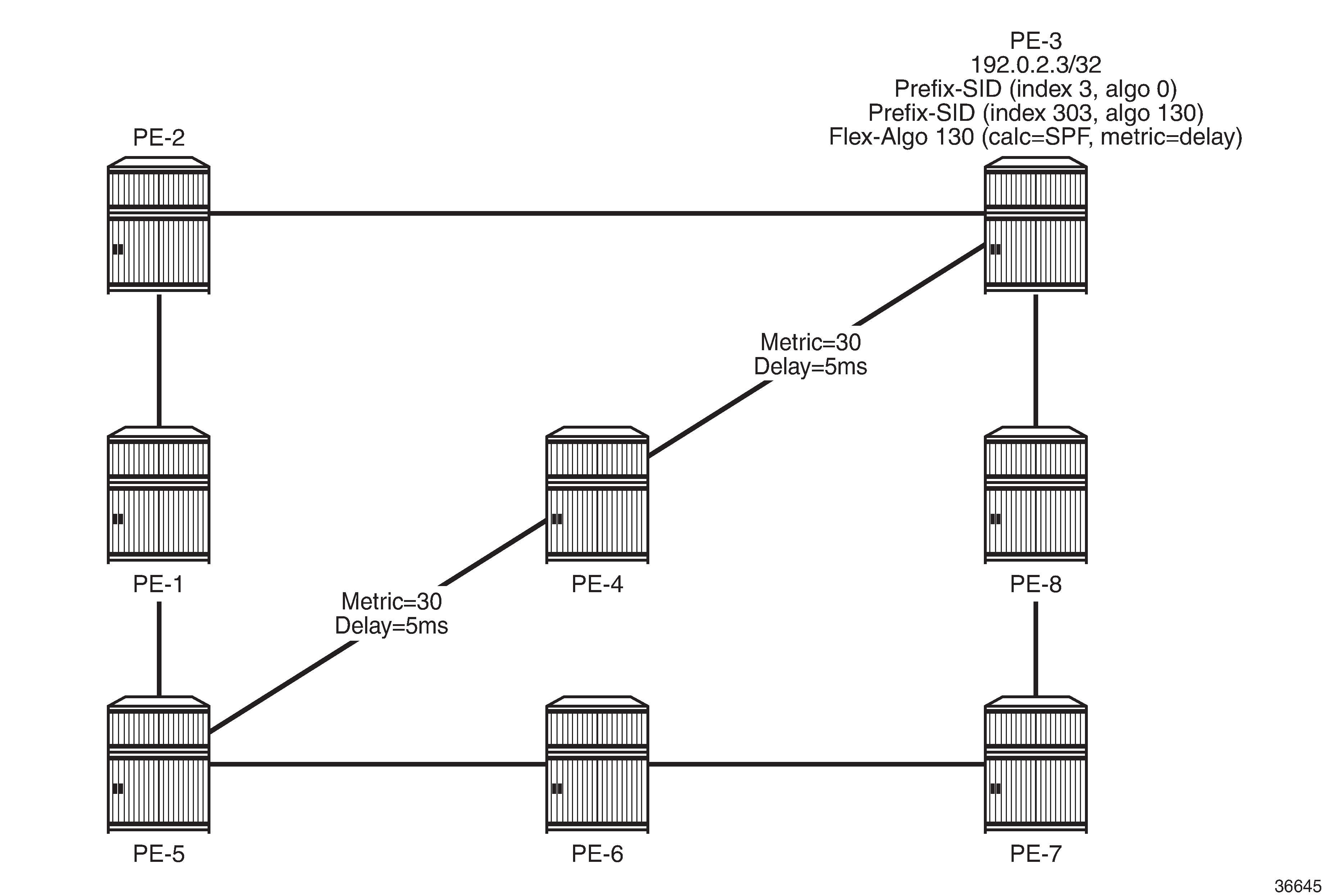 In addition to the default algorithm 0 (metric-based SPF), all routers participate in Flex-Algorithm 130 with FAD {calc-type=SPF, metric=delay, constraints=none}. Router PE-3 advertises prefix 192.0.2.3/32 with Prefix SID {index=3, algorithm=0} and Prefix SID {index=303, algorithm=130}. Router PE-5 has an SR-TE LSP provisioned with a destination of PE-3 (192.0.2.3) and a top (active) label of 1003. As a result, it is associated with algorithm 0 and uses the shortest path IGP metric PE-5-PE-1-PE-2-PE-3 to reach its destination. Router PE-5 is also provisioned with a second SR-TE LSP, again with a destination of PE-3 (192.0.2.3), but this time with a top (active) label of 1303. This second LSP is associated with Flex-Algorithm 130 and uses the shortest path delay metric PE-5-PE-4-PE-3 to reach its destination.