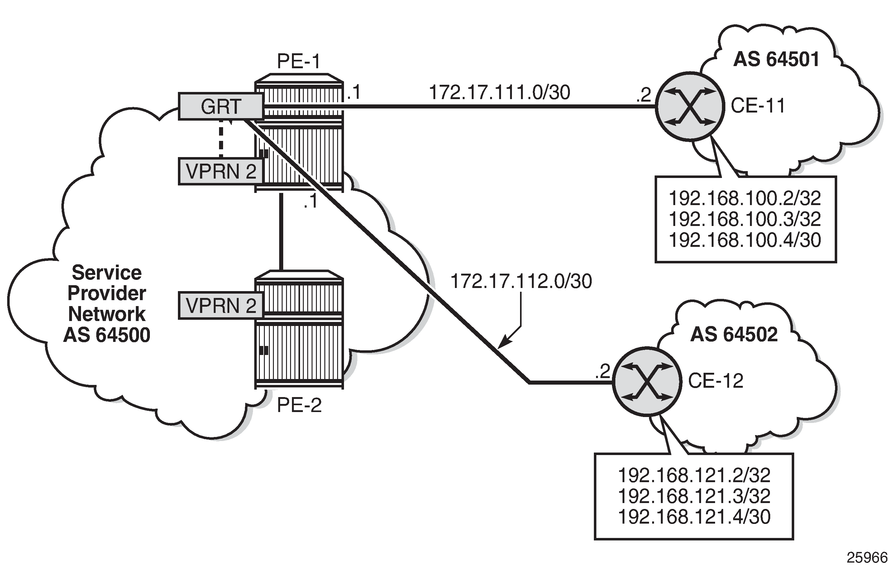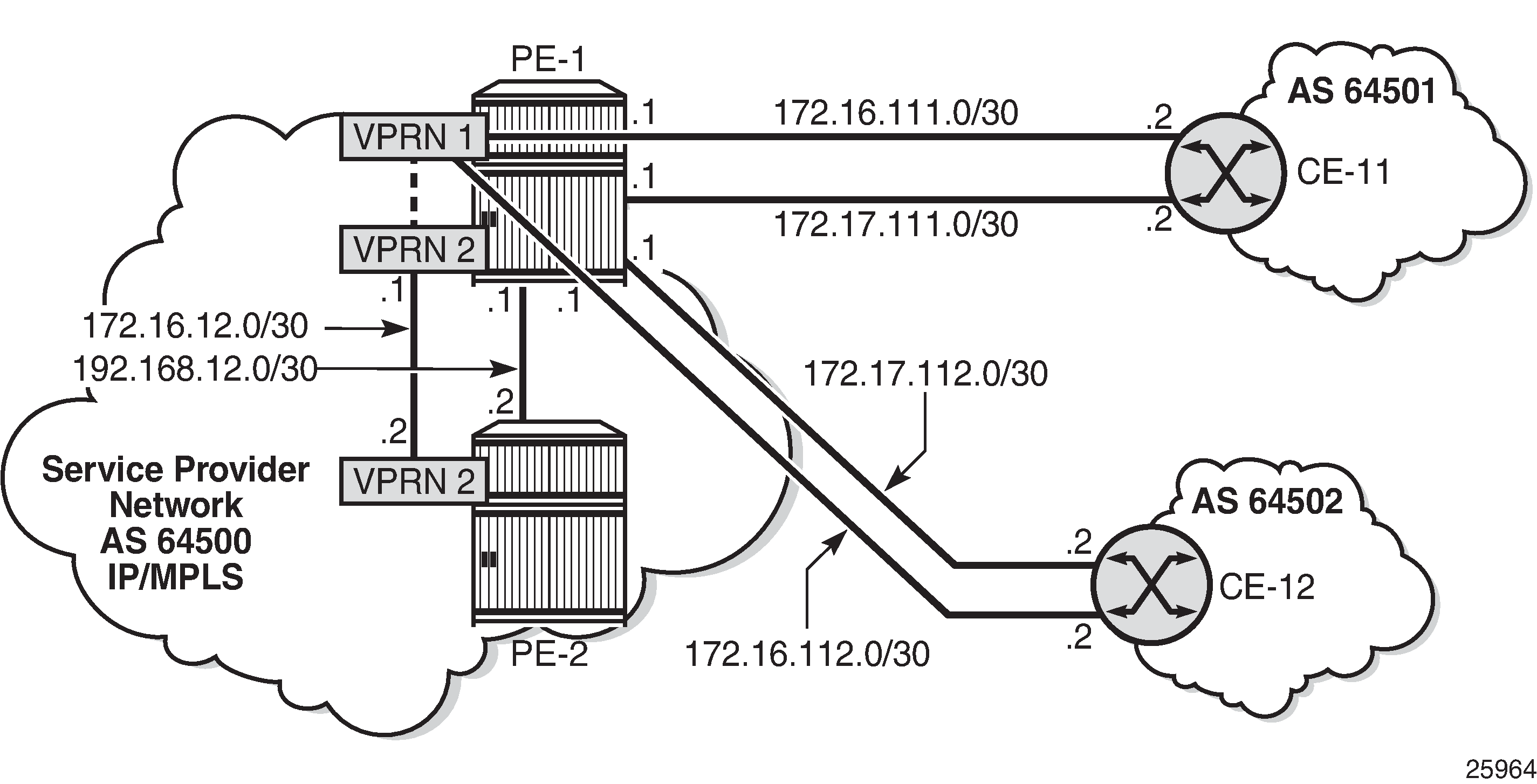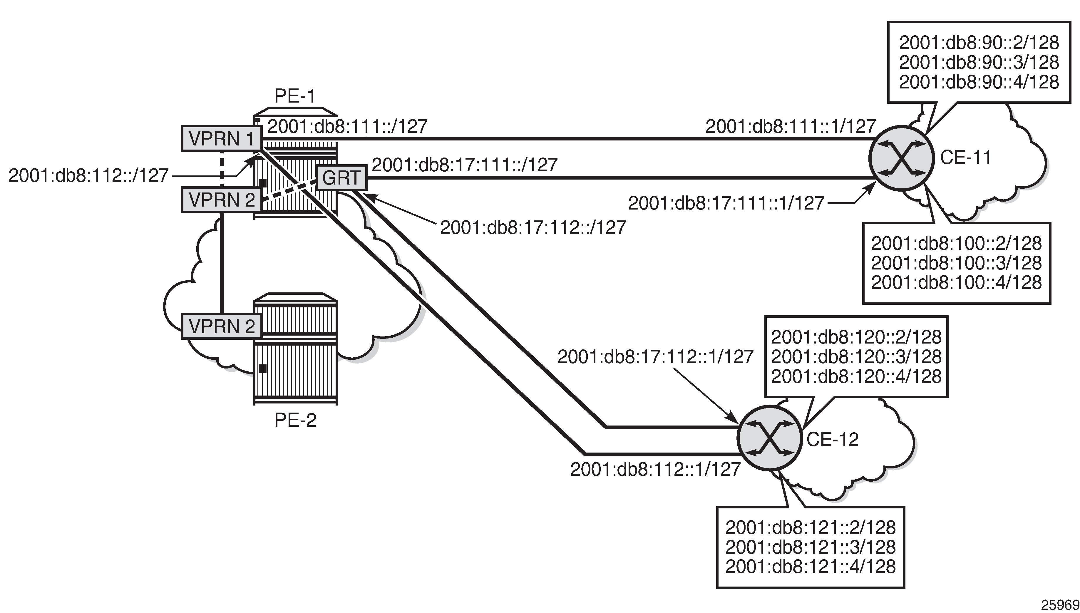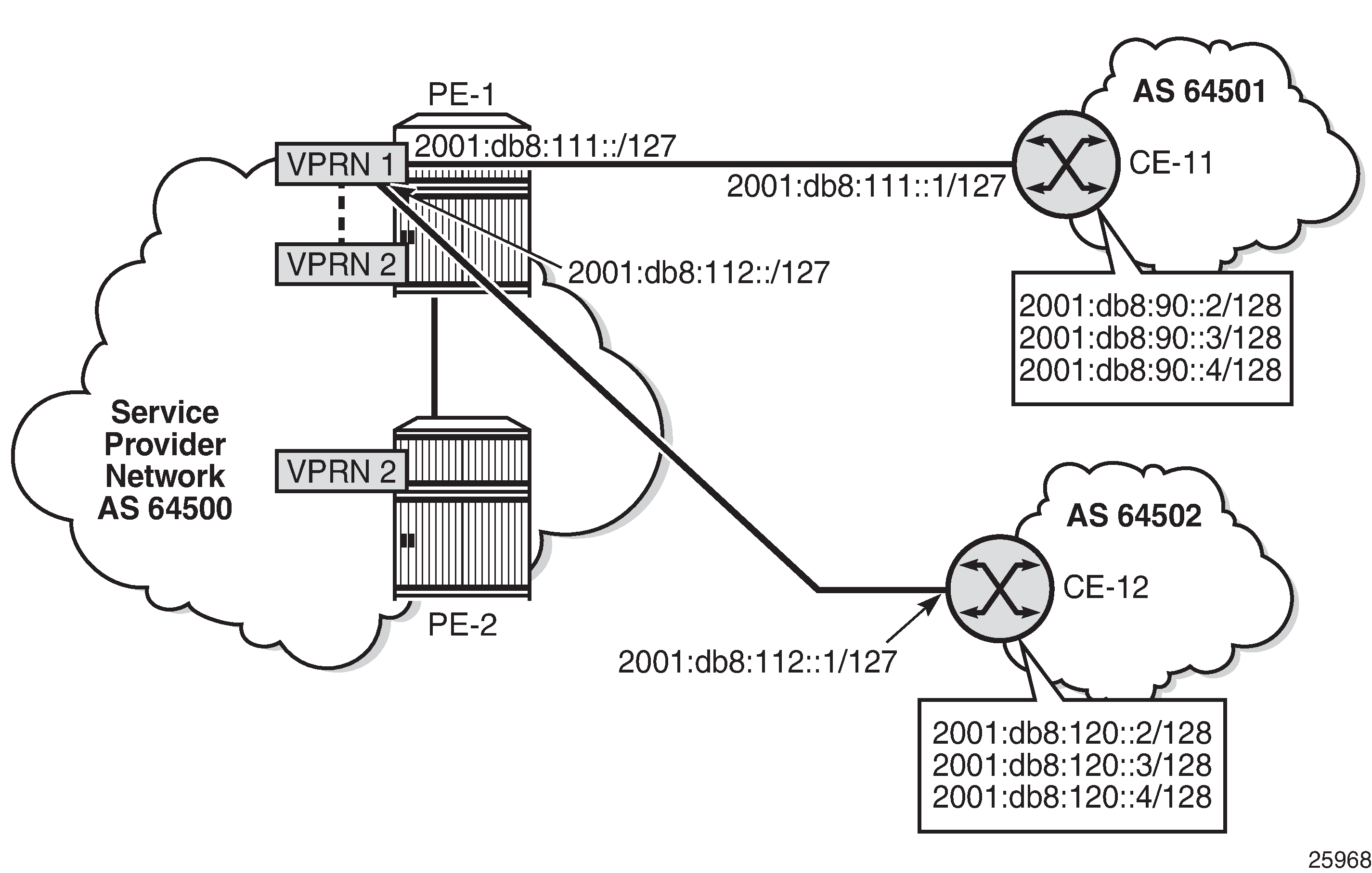 VPRN "VPRN 1" on PE-1; VPRN "VPRN 2" on PE-1 and PE-2