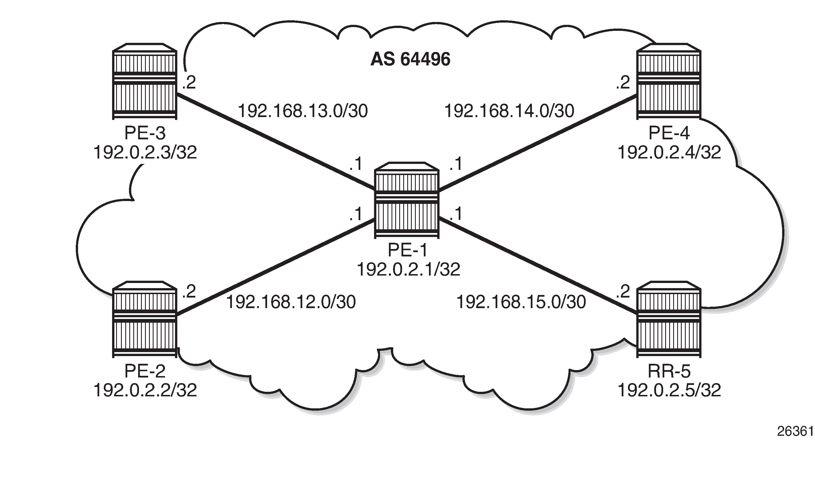 BGP sessions are established between the routers of AS 64496, using RR-5 as route reflector with PE-1, PE-2, PE-3, and PE-4 being the route reflector clients.
