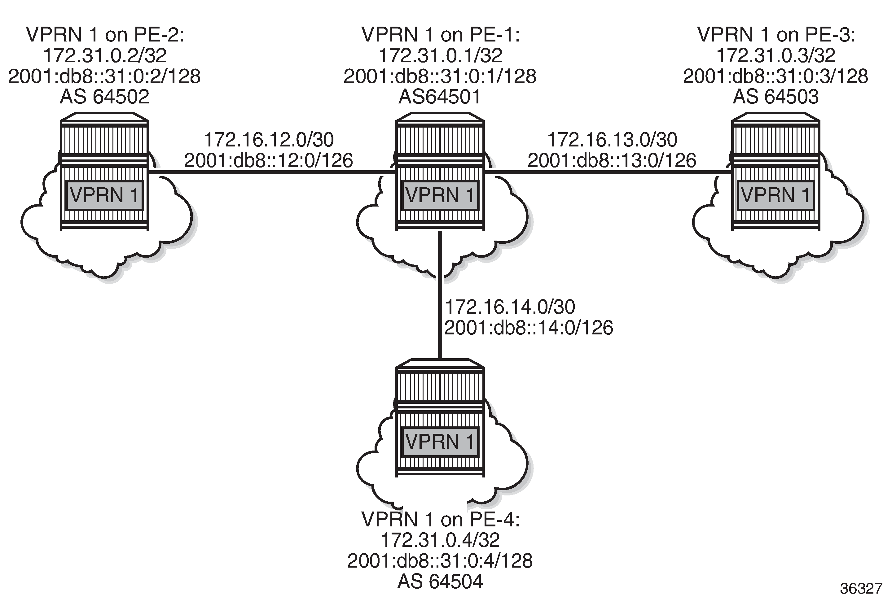 In VPRN 1 on PE-1, dynamic BGP peering is configured for IPv4 prefixes matching 172.16.0.0/16 in AS 64502 (PE-2) or AS 64504 (PE-4) and IPv6 prefixes matching 2001:db8::/107 ASN range from 64502 (PE-2) to 64503 (PE-3). The BGP configuration in VPRN 1 on PE-1 is as follows: