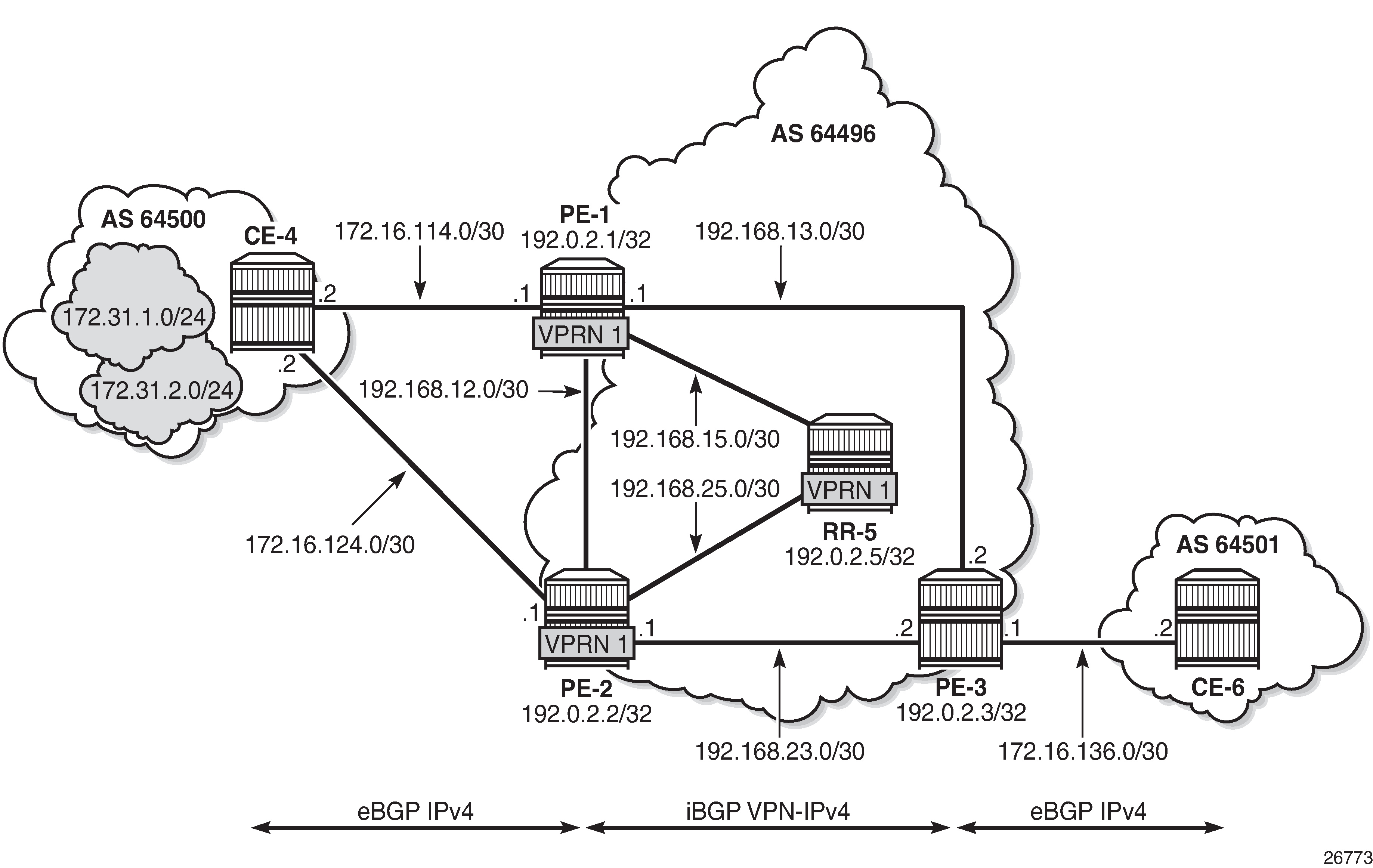 PE-1 peers with CE-4 in AS 65400 and RR-5 in AS 64496. The BGP configuration on PE-1 is as follows: